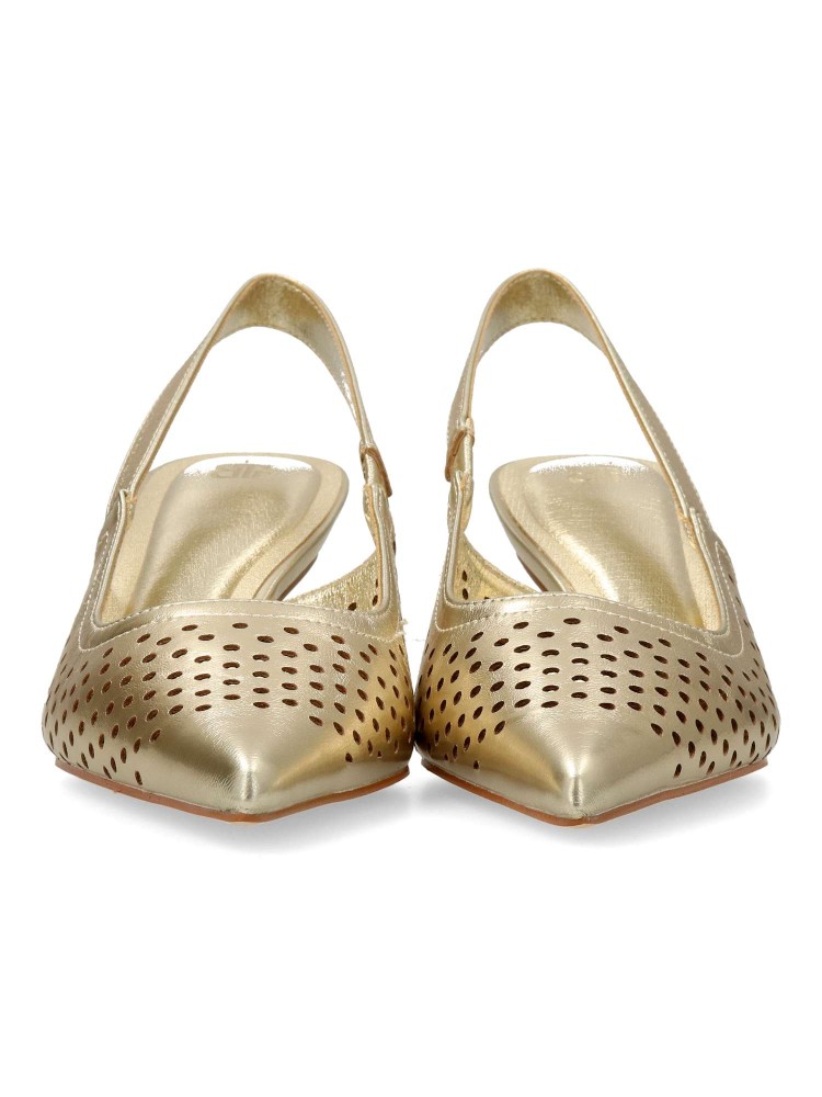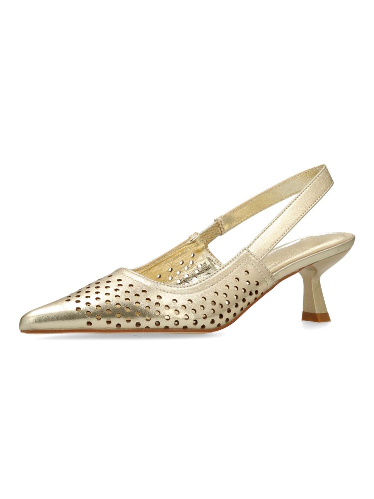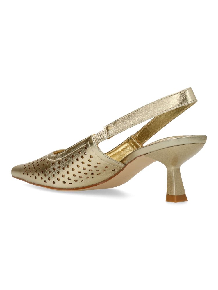 Zapato salón de mujer, con puntera fina y destalonado. Fabricado en material sintético troquelado. Planta acolchada. Color oro. Tacón fino de 5,5 cm. de altura. Modelo cómodo y elegante, ideal tanto para tu día a día, como para eventos y celebraciones.