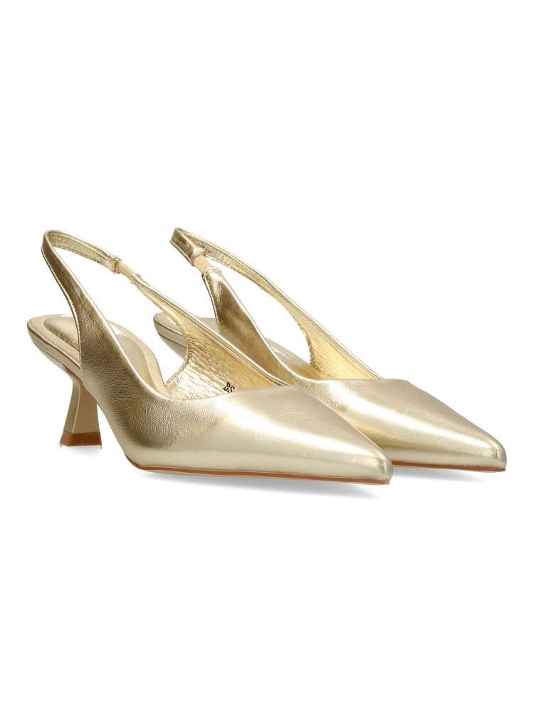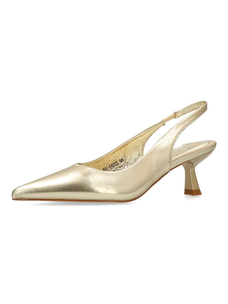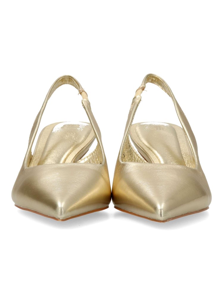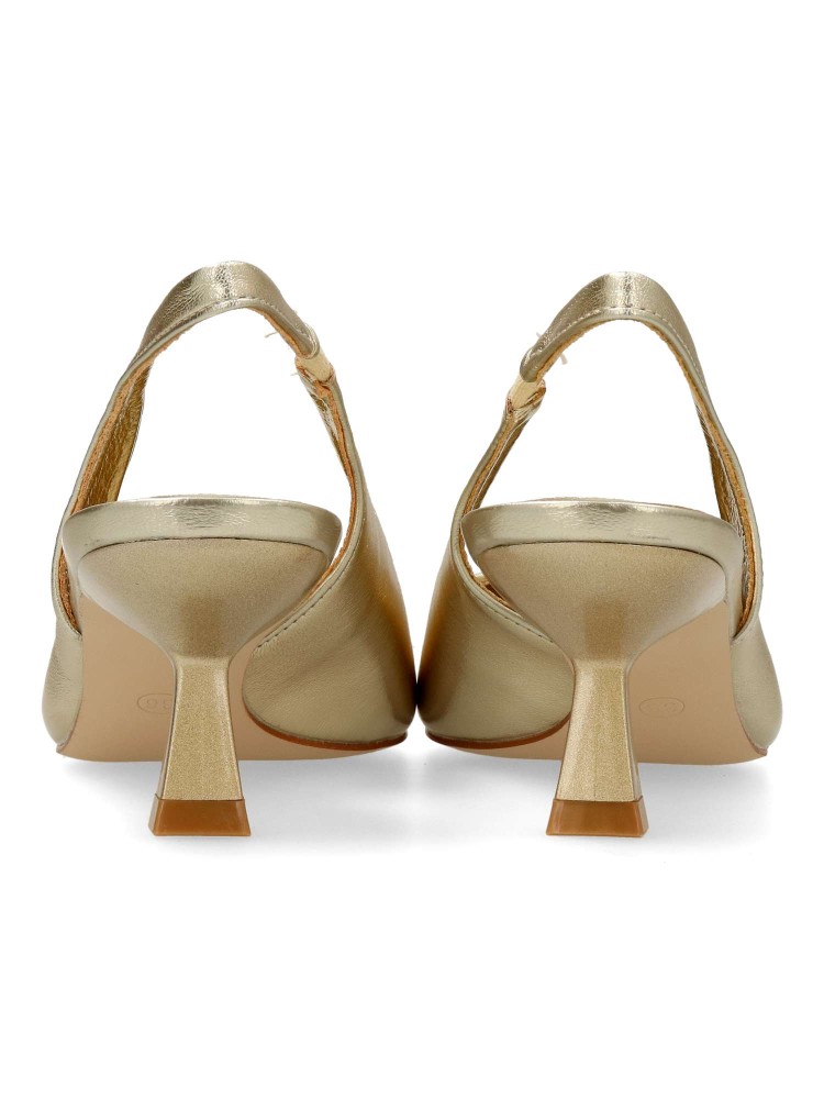 Zapato salón de mujer, con puntera fina y destalonado. Fabricado en material sintético. Planta acolchada. Color oro. Tacón fino de 5,5 cm. de altura. Modelo cómodo y elegante, ideal tanto para tu día a día, como para eventos y celebraciones.