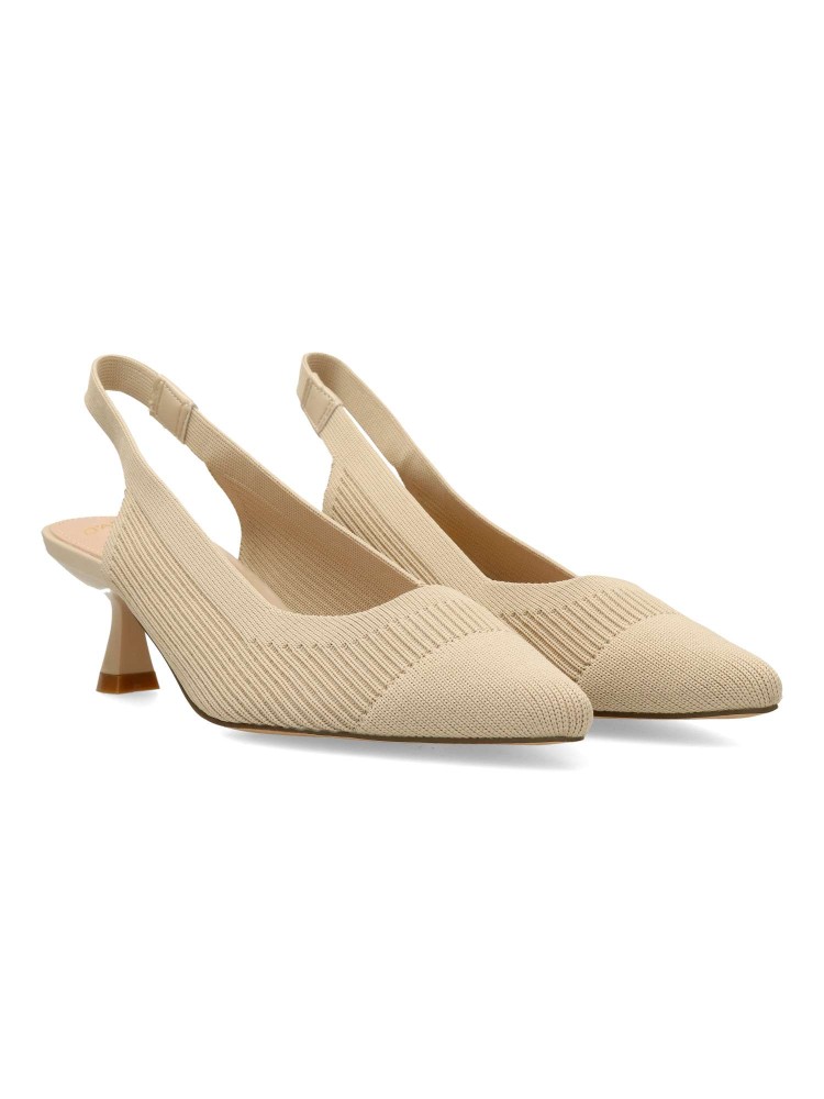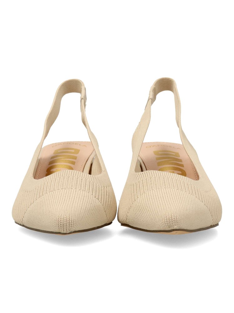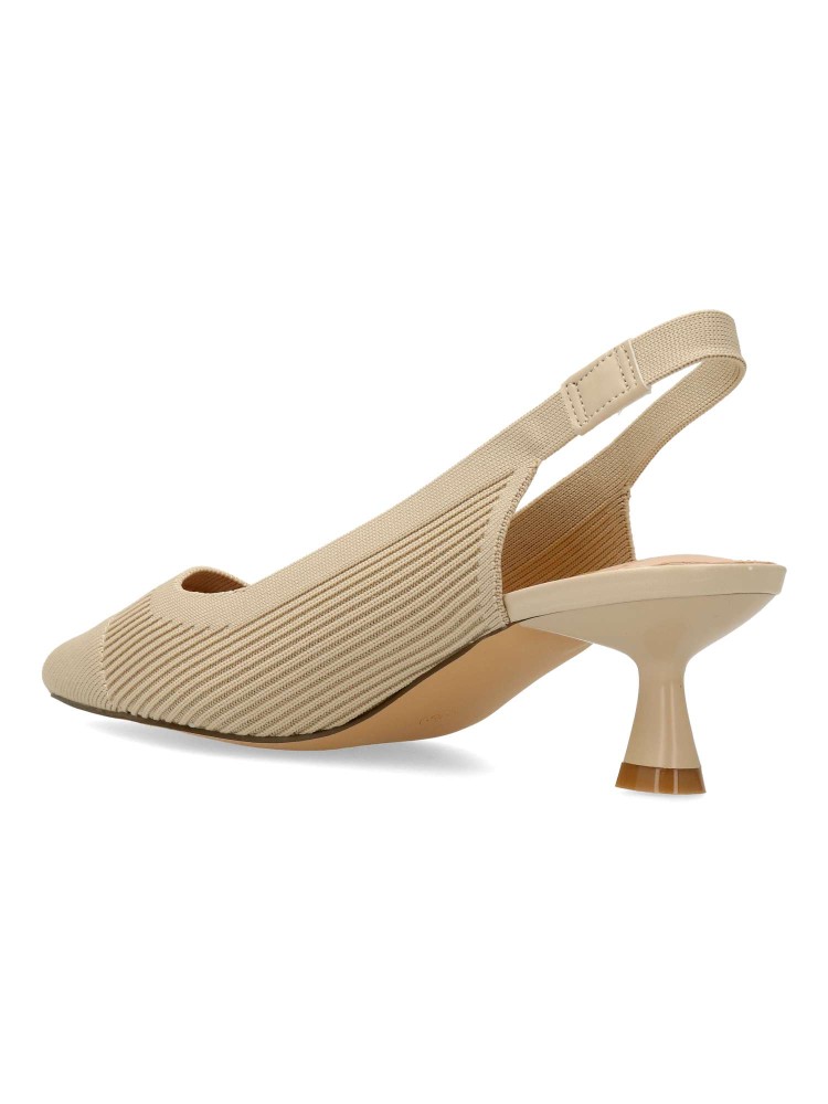 Salón cómodo de mujer destalonado. Fabricado en material textil transpirable color beige. Elástico para mejor calce. Planta acolchada. Tacón ancho de 5,5 cm. Modelo cómodo y elegante, ideal tanto para tu día a día, como para eventos y celebraciones.