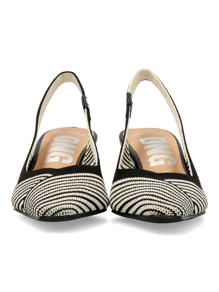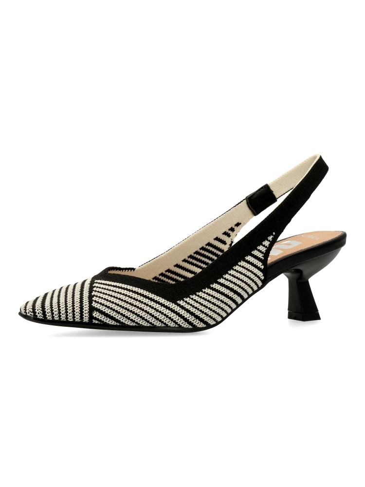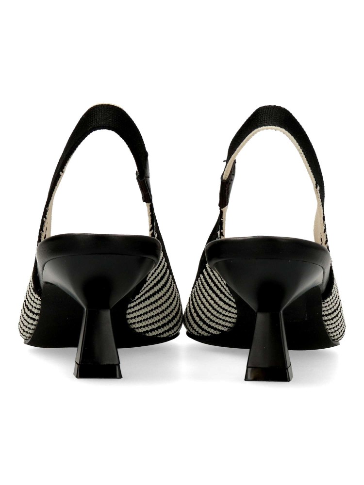 Salón cómodo de mujer destalonado. Fabricado en material textil transpirable color camel-negro. Elástico para mejor calce. Planta acolchada. Tacón de 5,5 cm. Modelo cómodo y elegante, ideal tanto para tu día a día, como para eventos y celebraciones.