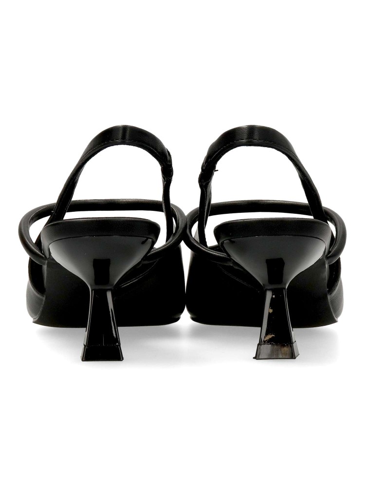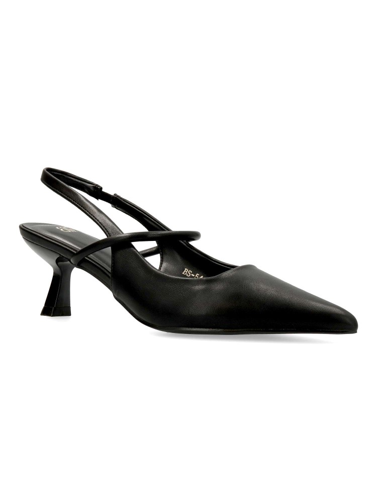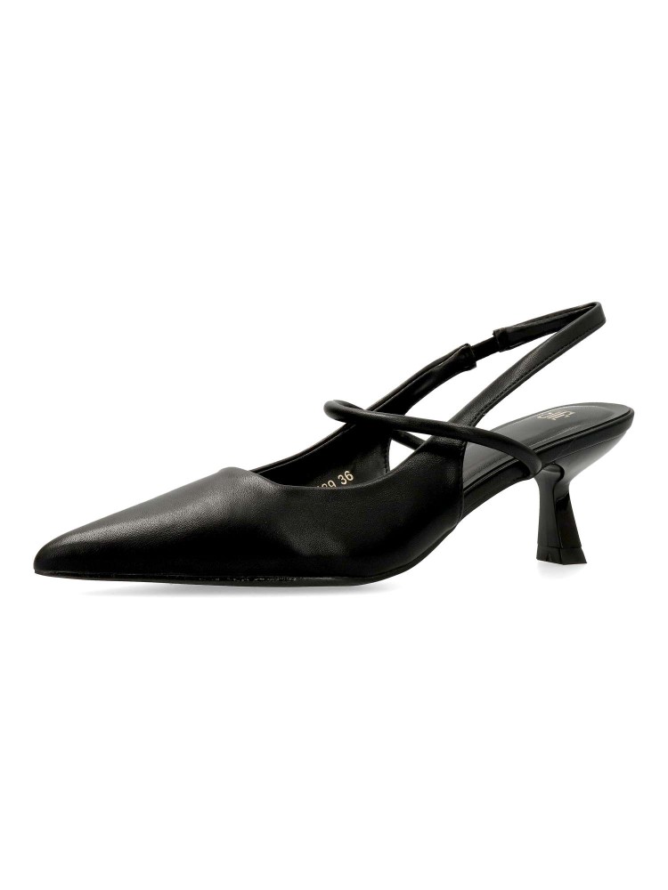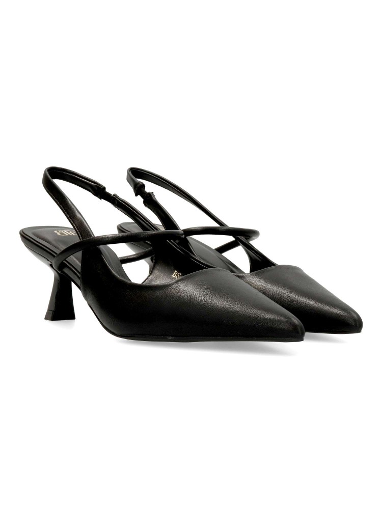 Zapato salón de mujer, con puntera fina, destalonado y tira al empeine. Fabricado en napa sintética. Planta acolchada. Color negro. Tacón fino de 5,5 cm. de altura. Modelo cómodo y elegante, ideal para fiestas, eventos y celebraciones.
