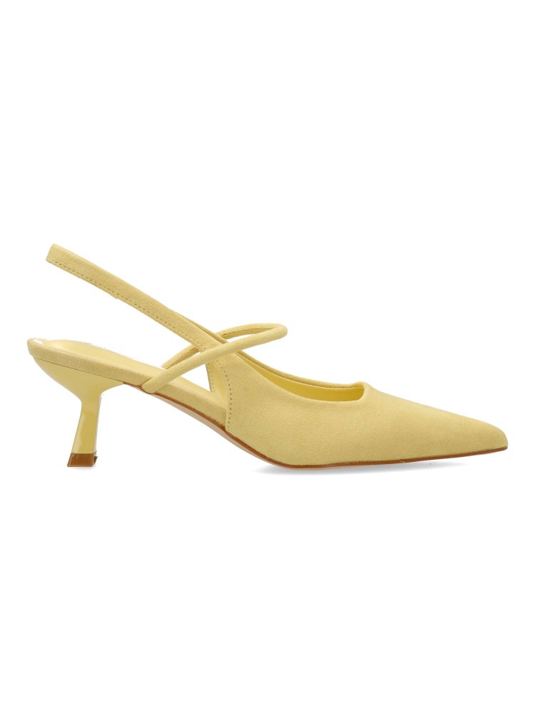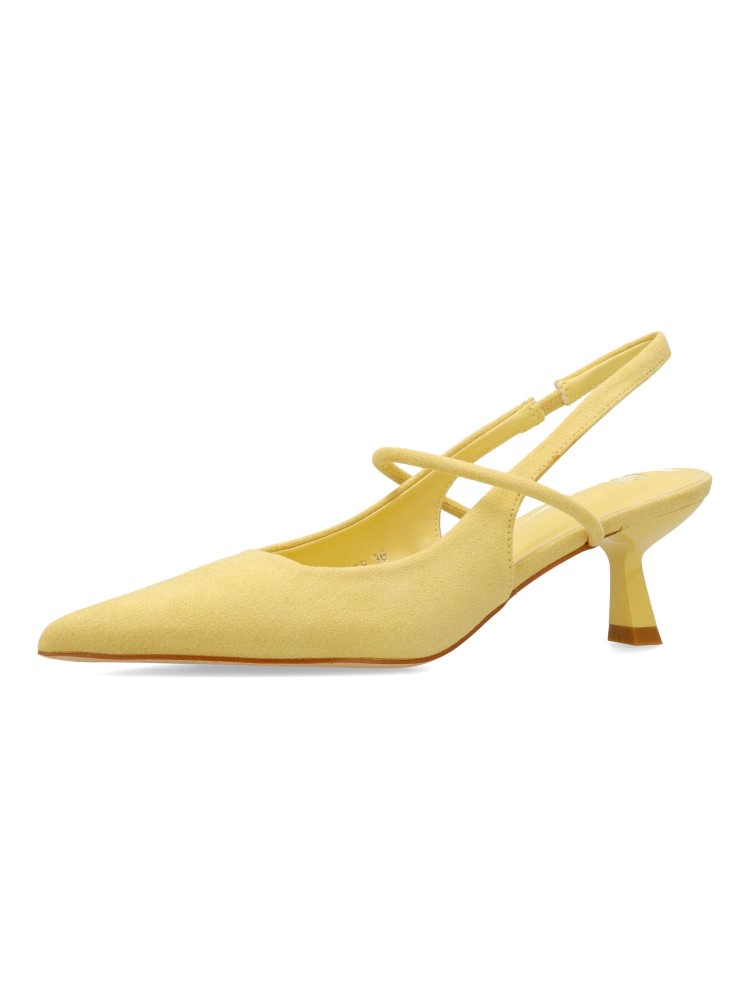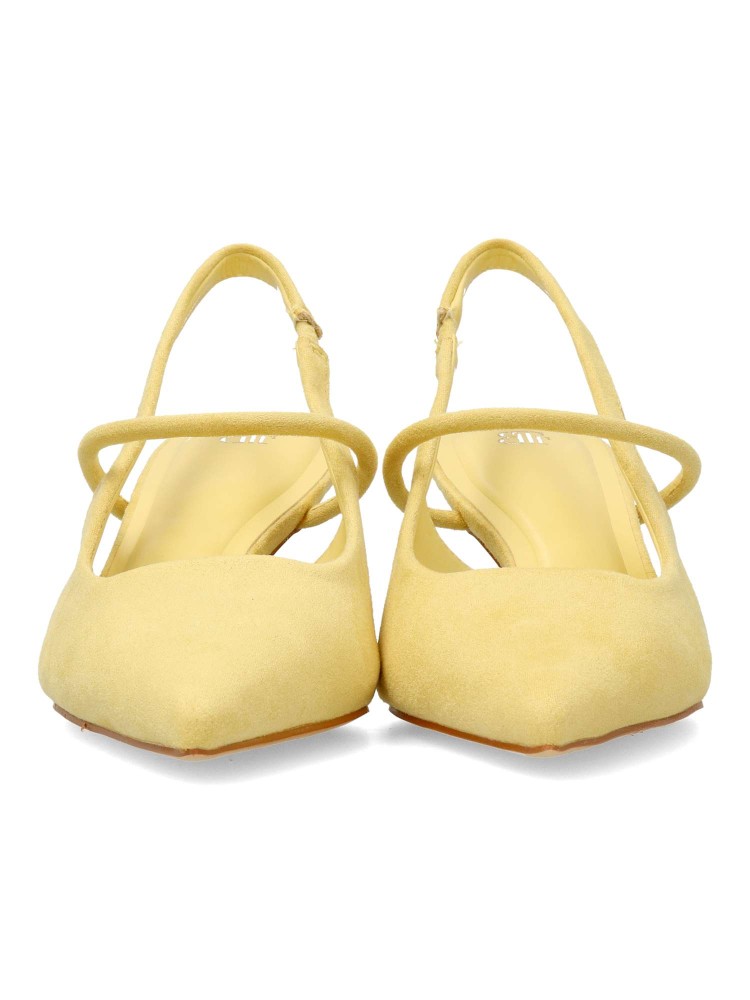 Zapato salón de mujer, con puntera fina, destalonado y tira al empeine. Fabricado en antelina aterciopelada. Planta acolchada. Color amarillo. Tacón fino de 5,5 cm. de altura. Modelo cómodo y elegante, ideal para fiestas, eventos y celebraciones.