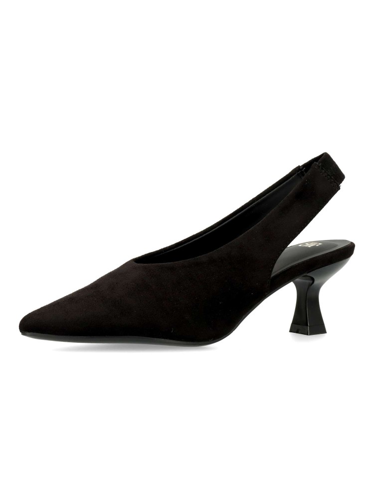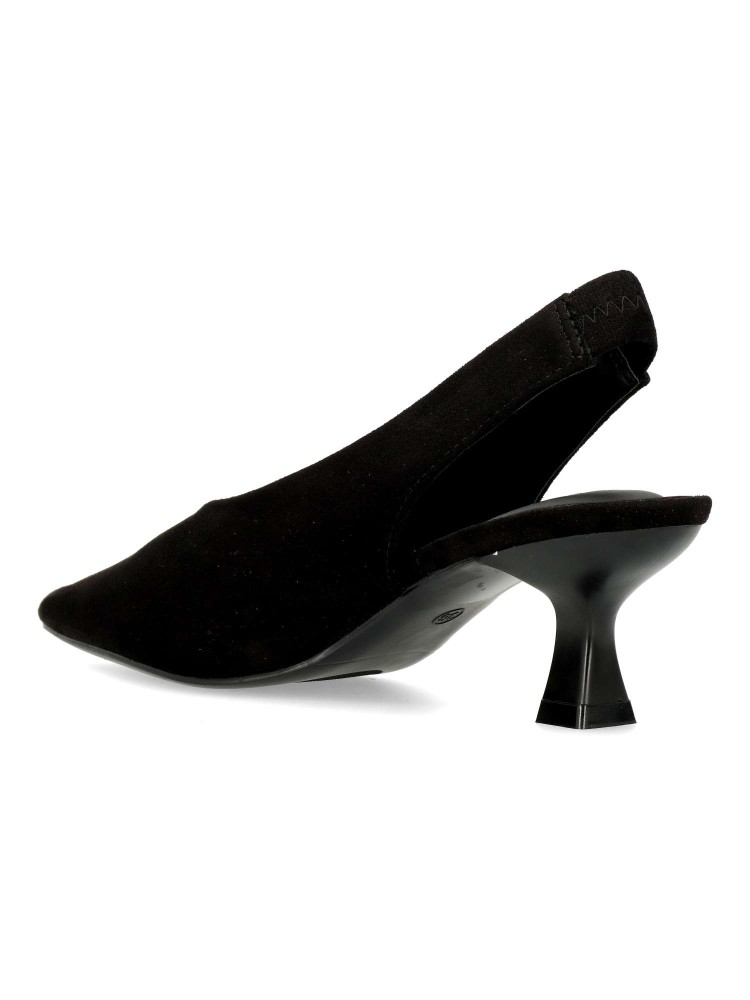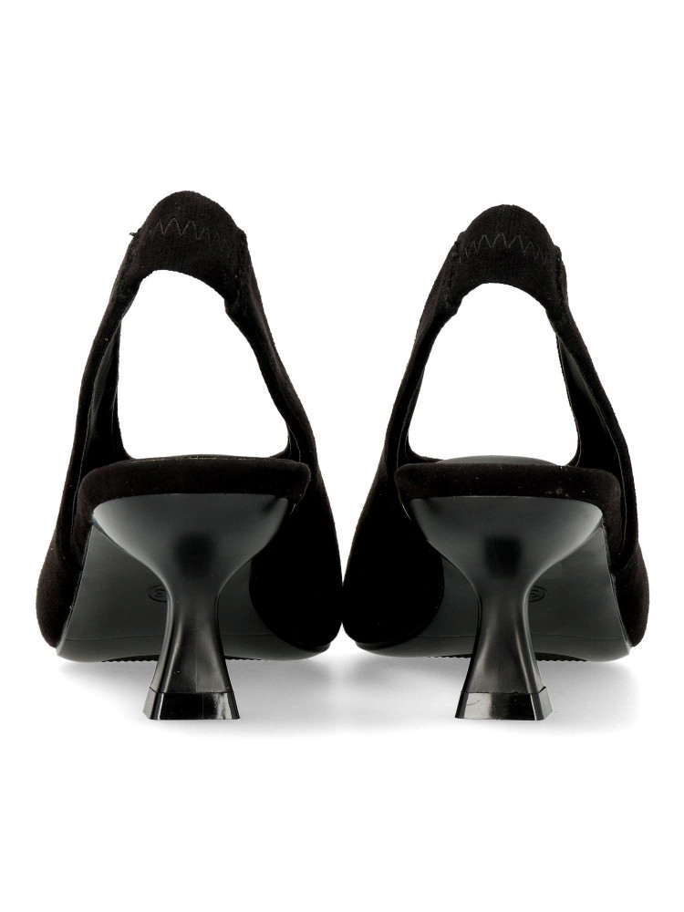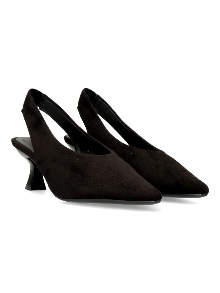 Zapato salón de mujer, con puntera fina y destalonado. Fabricado en antelina aterciopelada. Planta acolchada. Disponible en color negro. Tacón fino de 5,5 cm. de altura. Modelo cómodo y elegante, ideal para fiestas, eventos y celebraciones.