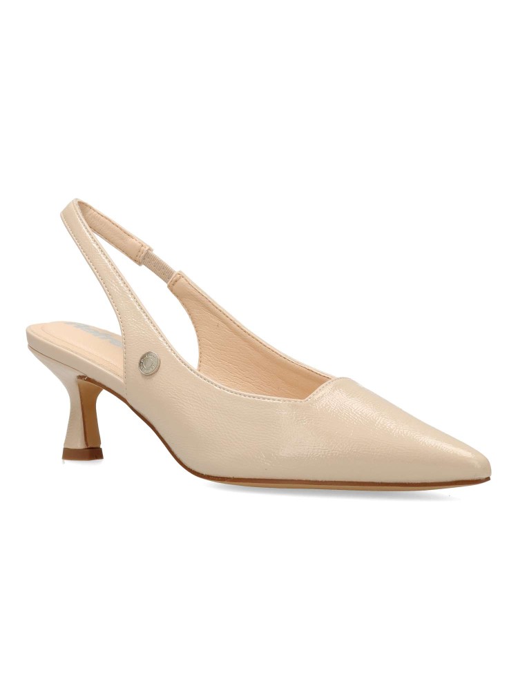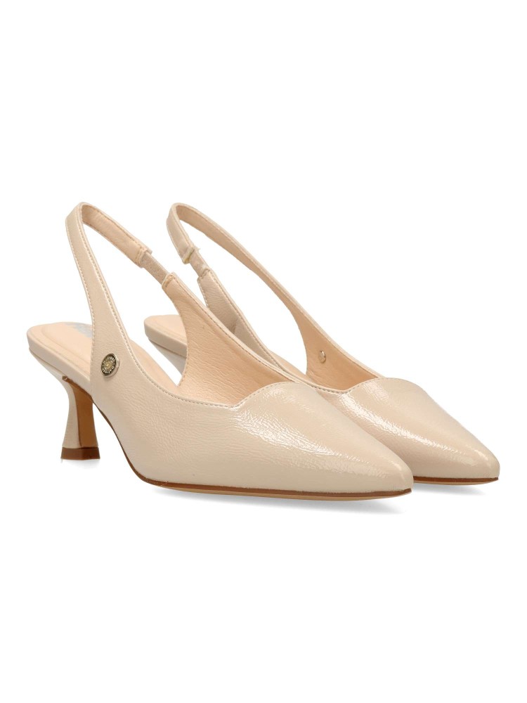 Salón de mujer, con punta fina y destalonado. Fabricado en material sintético grabado. Planta acolchada. Color beige. Tacón fino de 5,5 cm. Modelo cómodo y elegante, ideal tanto para tu día a día, como para eventos y celebraciones. Certificado vegano.