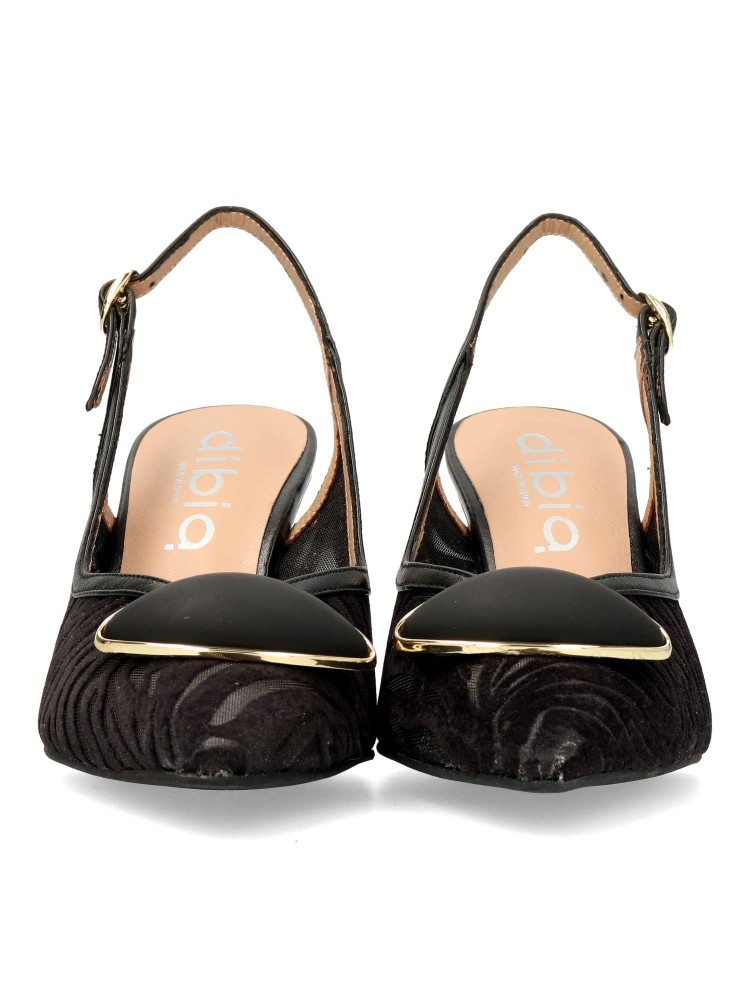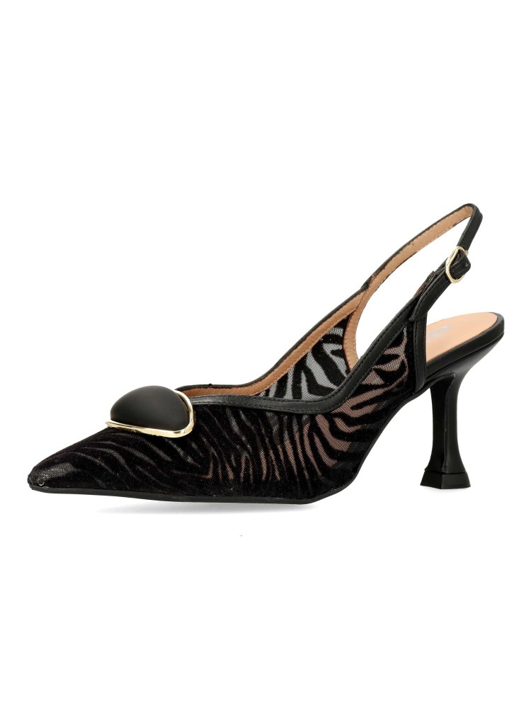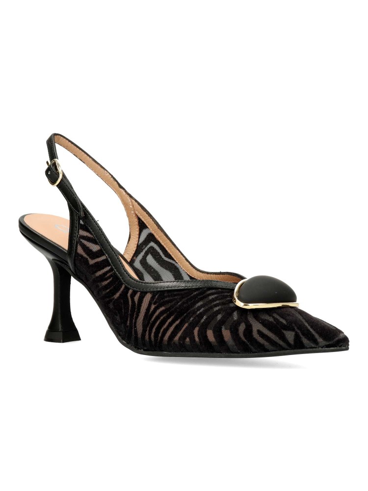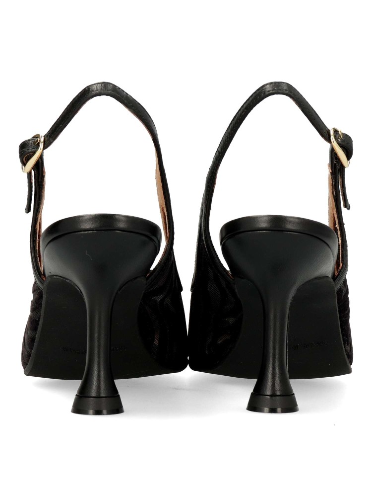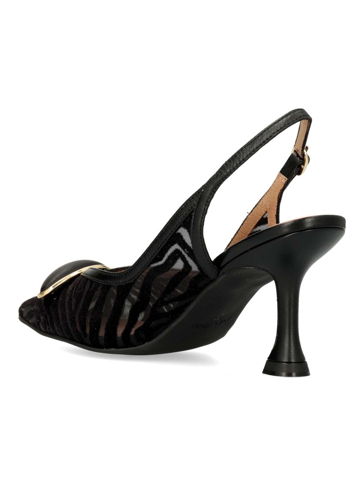 Salón destalonado fabricado en piel suave combinado con malla al tono y planta acolchada que garantizan una comodidad total. Cierre mediante hebilla, tacón de 7,5 cm. Diseño elegante, muy recomendado para Novias, Madrinas e Invitadas. Fabricado en España.
