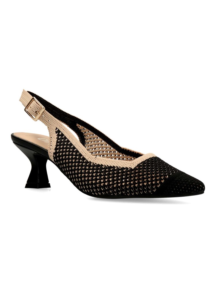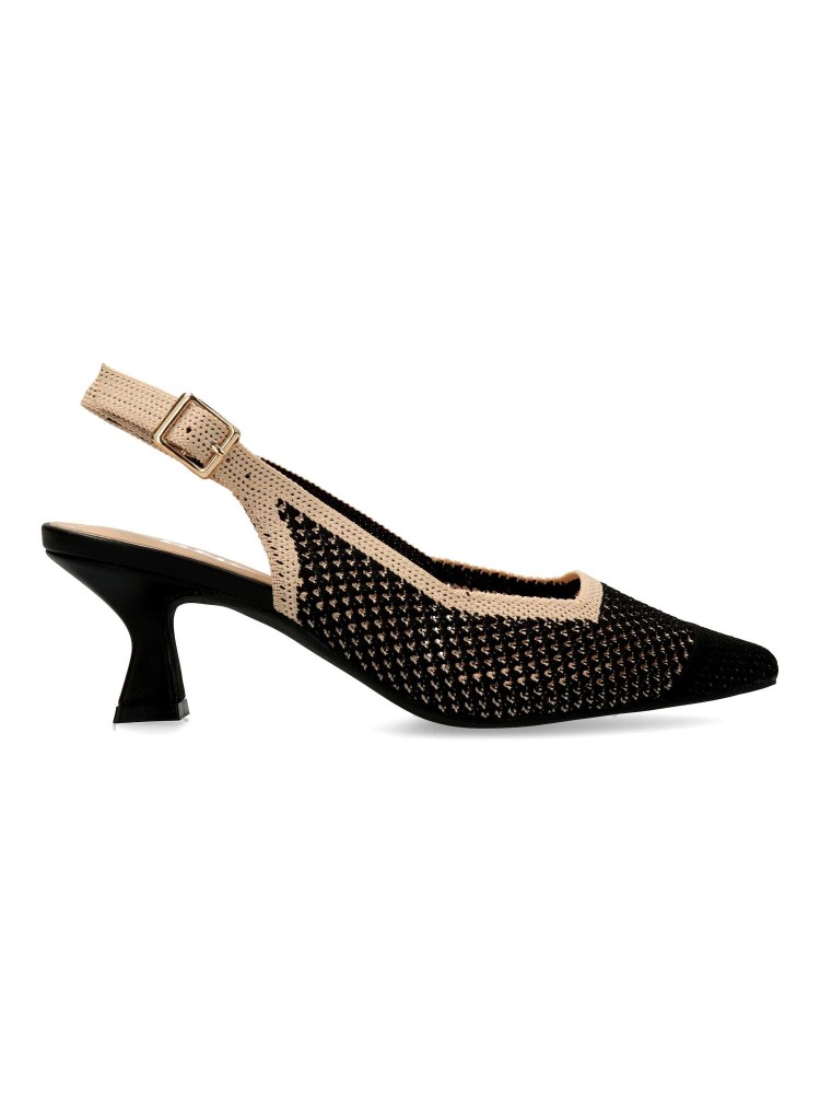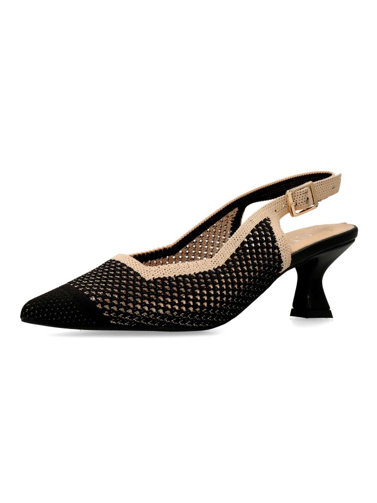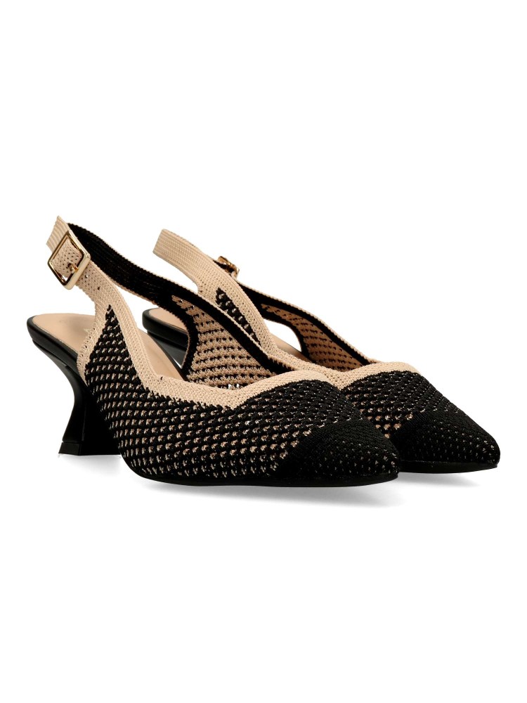 Salón cómodo de mujer destalonado. Fabricado en material textil transpirable color negro-beige. Cierre de hebilla. Planta acolchada. Tacón de 5,5 cm. Modelo cómodo y elegante, ideal tanto para tu día a día, como para eventos y celebraciones.