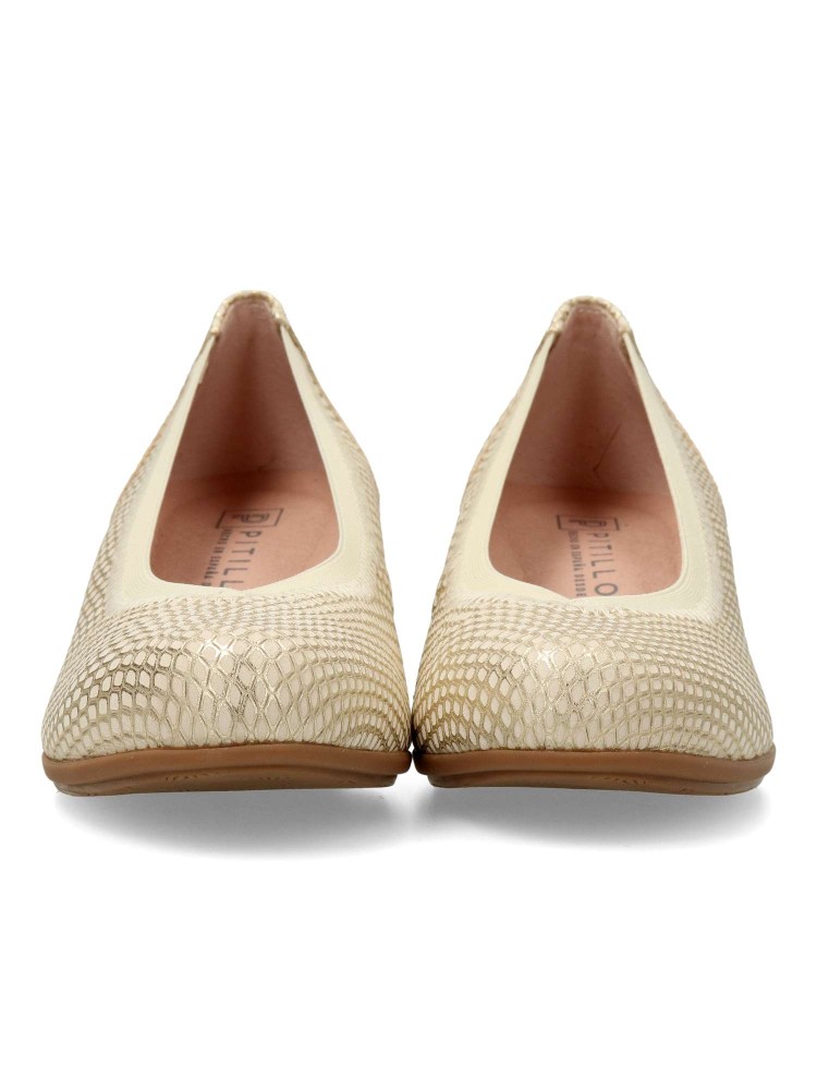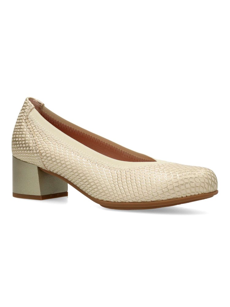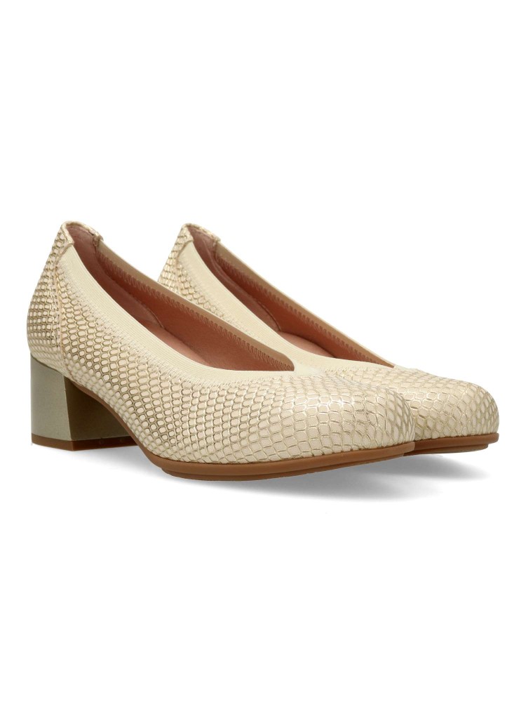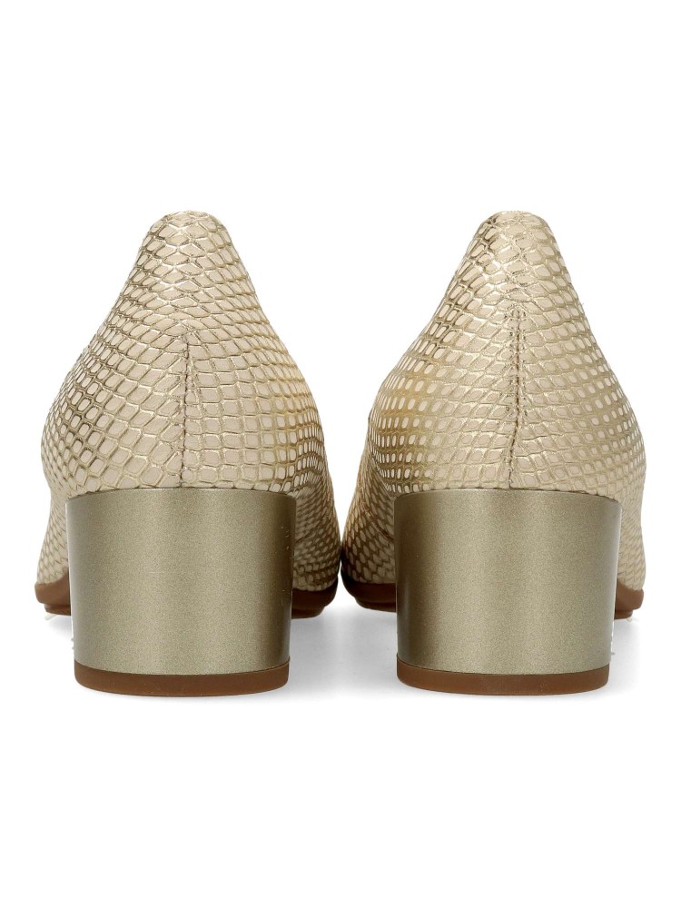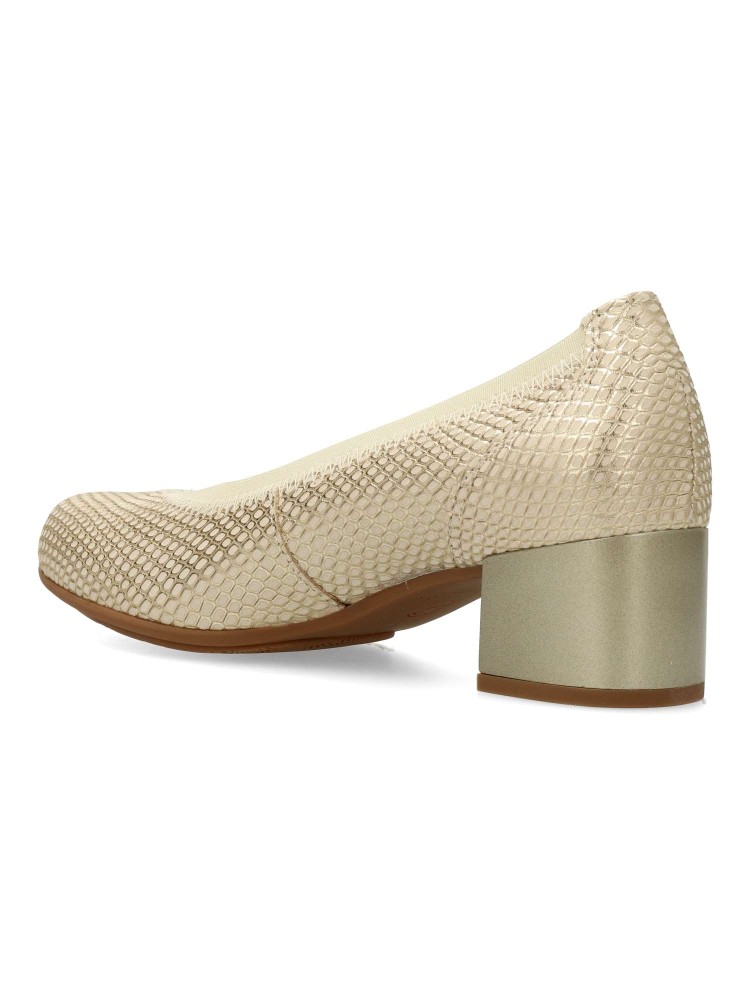 Un zapato básico, ligero y cómodo, que no debe faltar en tu armario. Zapato salón fabricado en piel grabada, con suela de goma flexible. Color oro. Altura tacón 4,5 cm. Diseño y confort, ideal tanto para tu día a día, como celebraciones. Hecho en España.