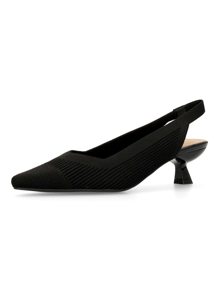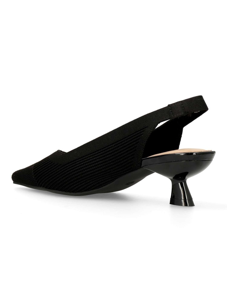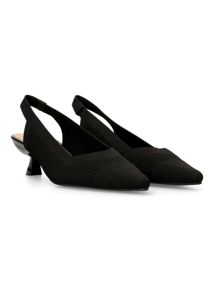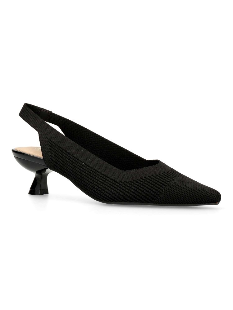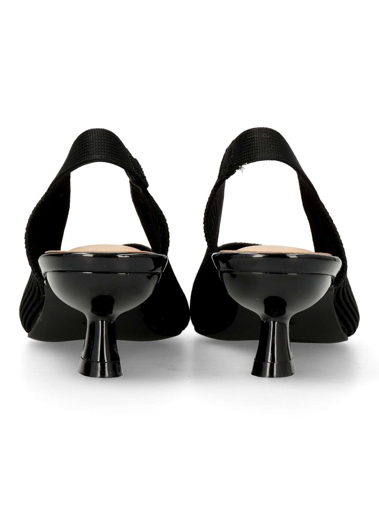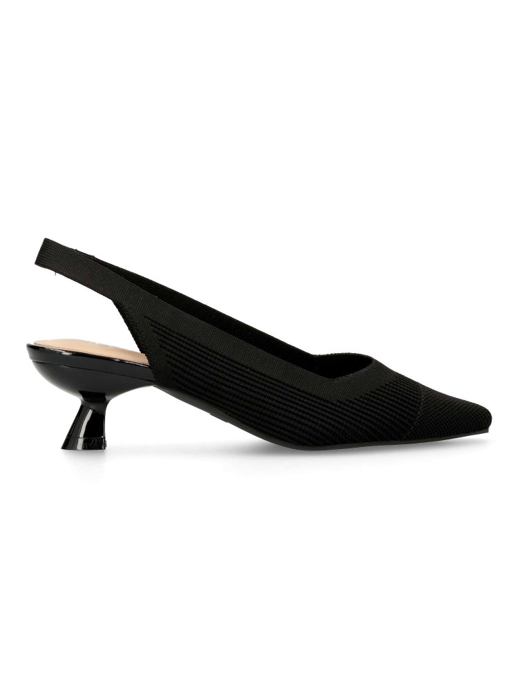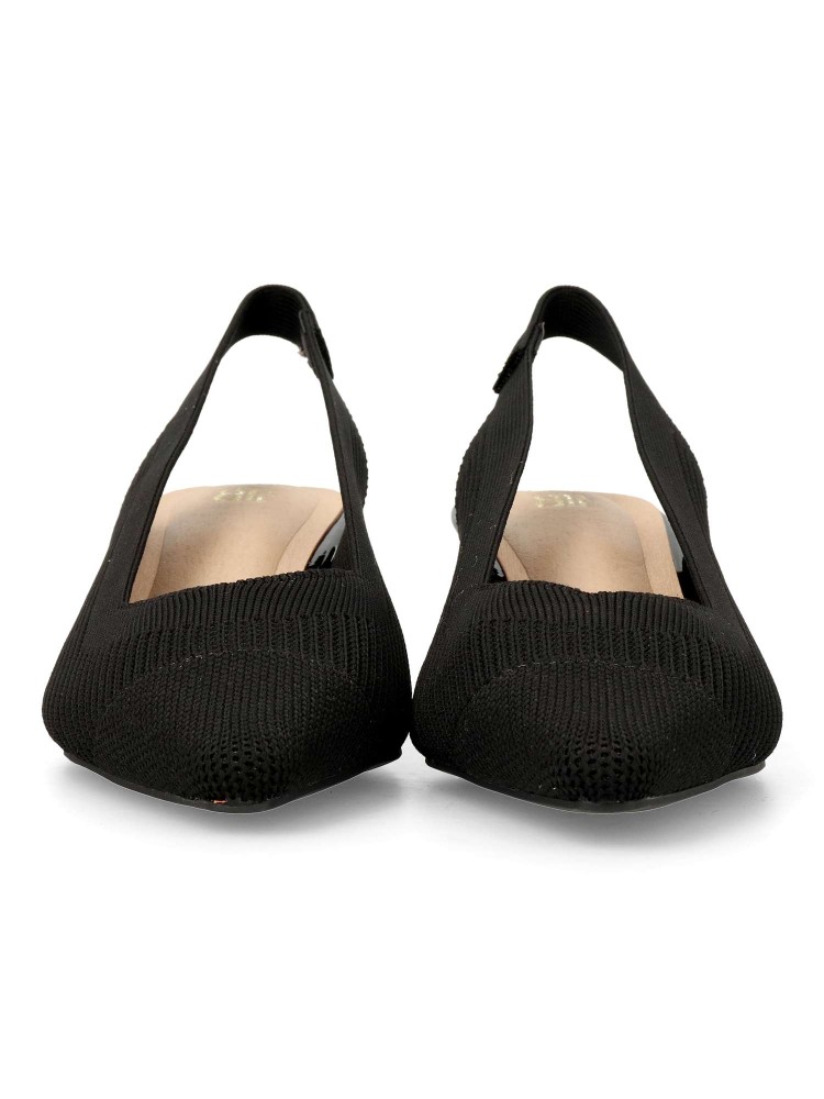 Salón de mujer con punta fina y destalonado. Fabricada en textil, con suela de goma. Plantilla acolchada. Color negro. Tacón de 4,5 cm. Diseño elegante, cómodo y versátil, que podras combinar con todos tus looks de temporada.