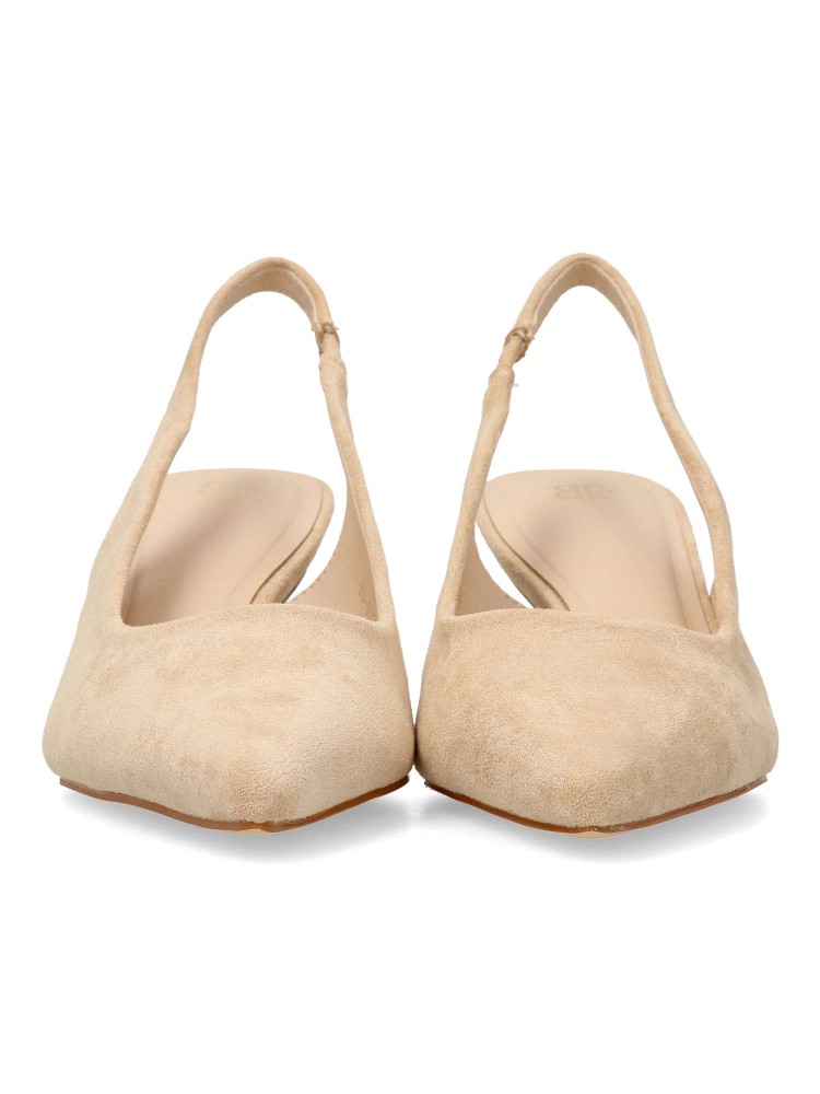 Zapato salón de mujer, con puntera fina y destalonado. Fabricado en antelina aterciopelada. Planta acolchada. Disponible en color beige. Tacón fino de 5,5 cm. de altura. Modelo cómodo y elegante, ideal para fiestas, eventos y celebraciones.