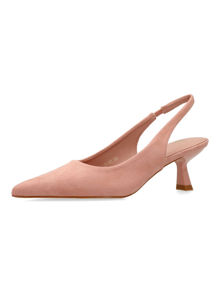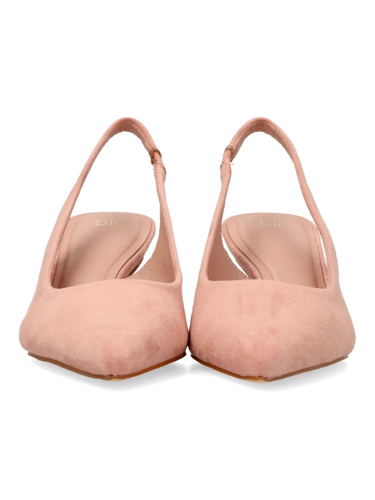 Zapato salón de mujer, con puntera fina y destalonado. Fabricado en antelina aterciopelada. Planta acolchada. Disponible en color rosa. Tacón fino de 5,5 cm. de altura. Modelo cómodo y elegante, ideal para fiestas, eventos y celebraciones.