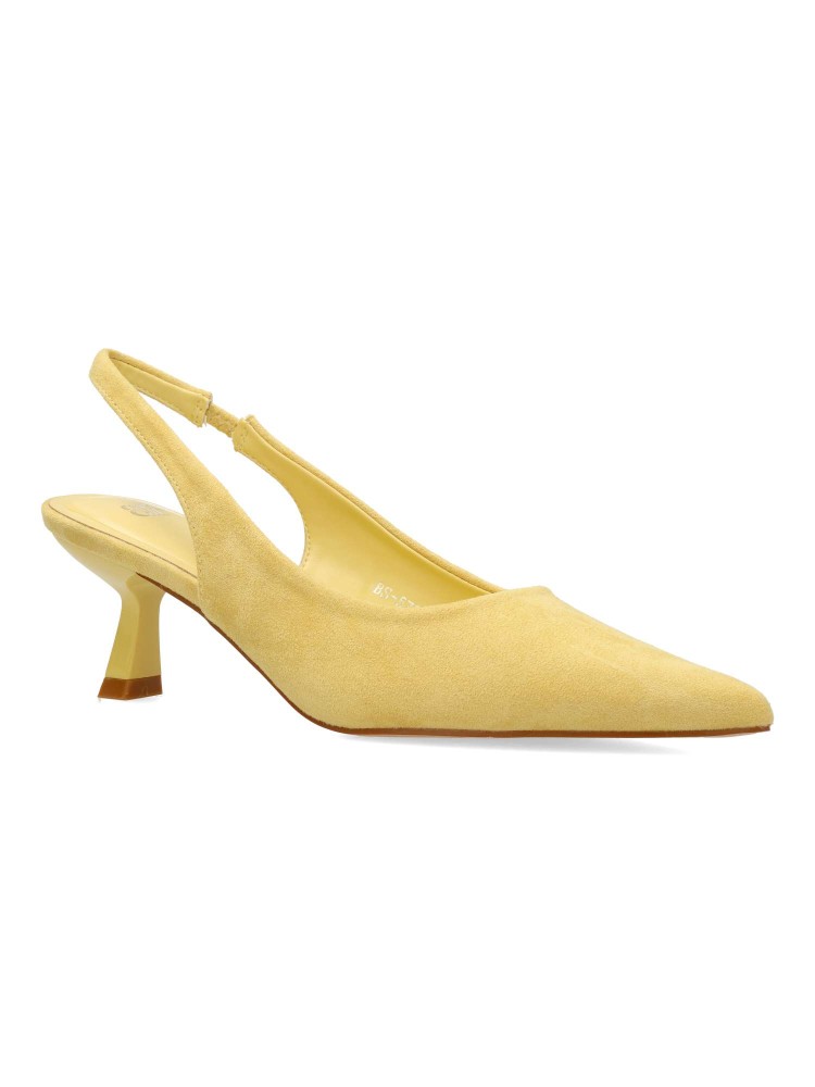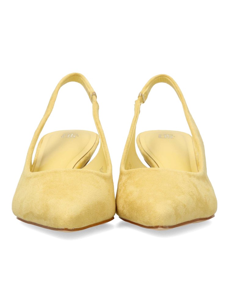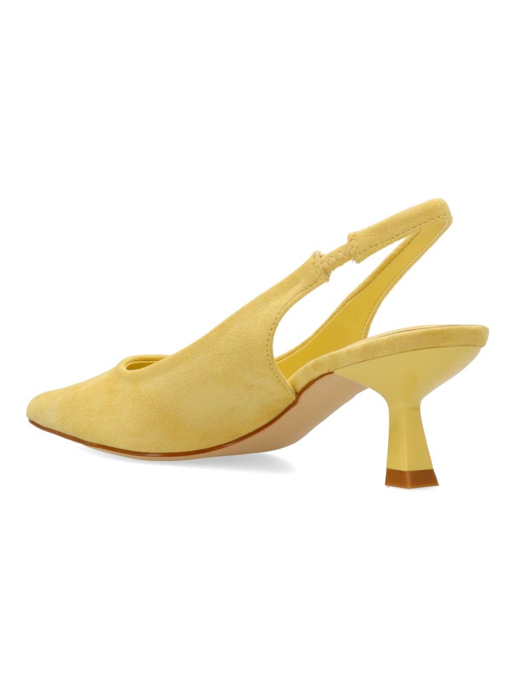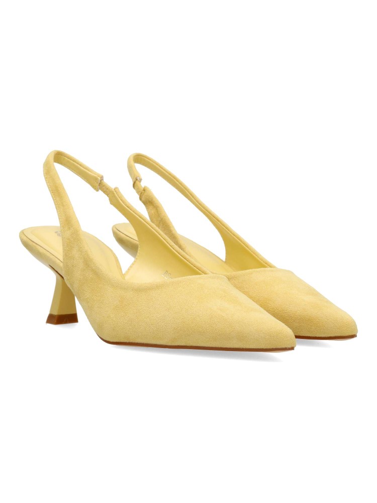 Zapato salón de mujer, con puntera fina y destalonado. Fabricado en antelina aterciopelada. Planta acolchada. Disponible en color amarillo. Tacón fino de 5,5 cm. de altura. Modelo cómodo y elegante, ideal para fiestas, eventos y celebraciones.