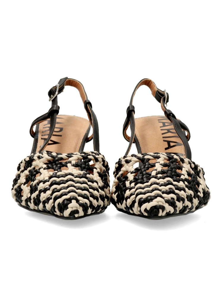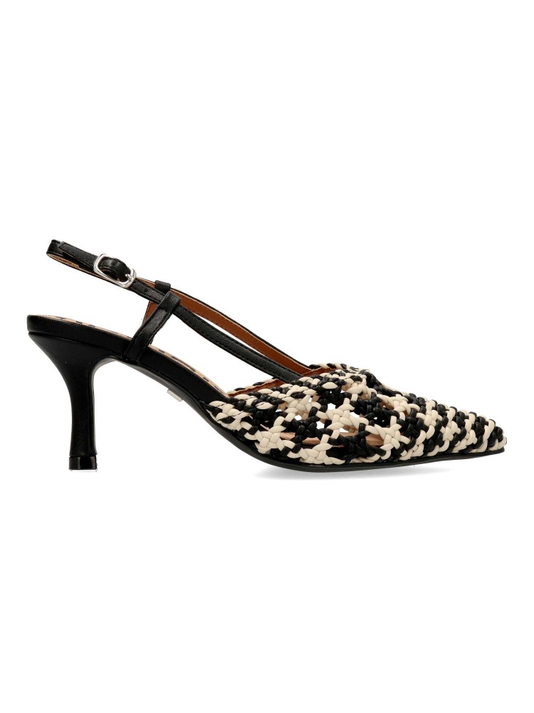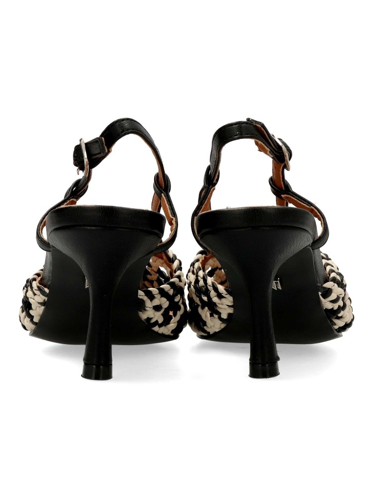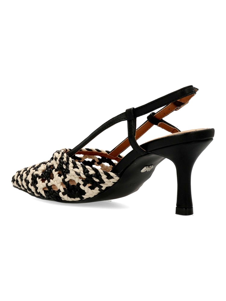 Diseñado con punta afilada, cuerpo trenzado multicolor y acabado elegante que aporta textura y originalidad. Tacón de 7 cm. Plantilla con tecnología Airfit. Ideal para combinar con vestidos o conjuntos más especiales. Certificado vegano