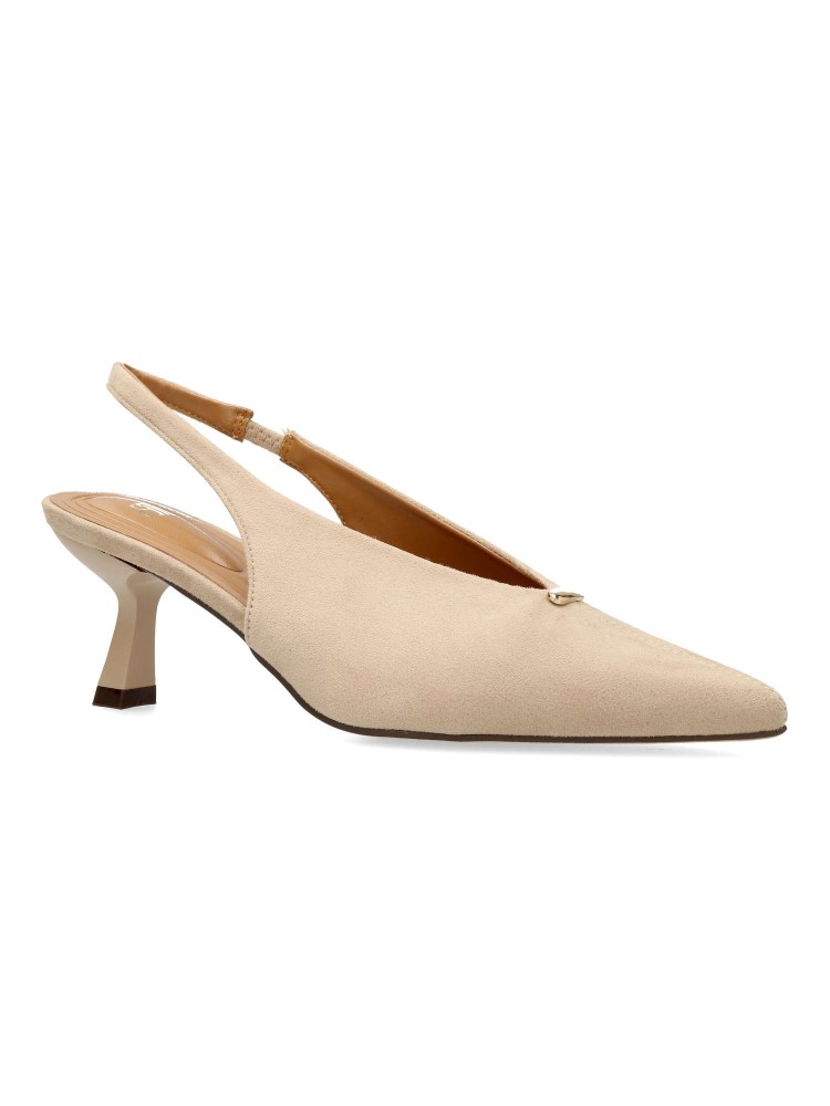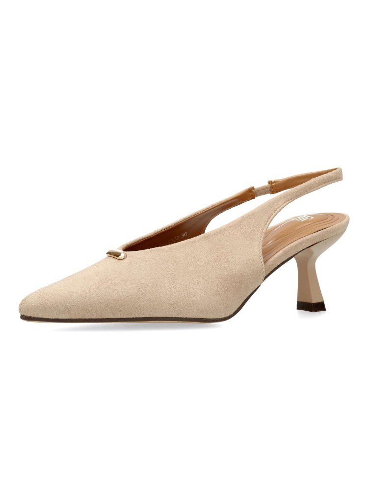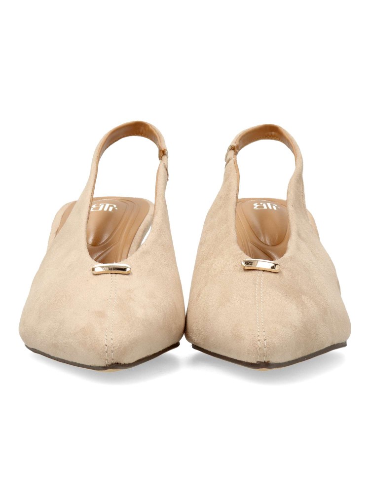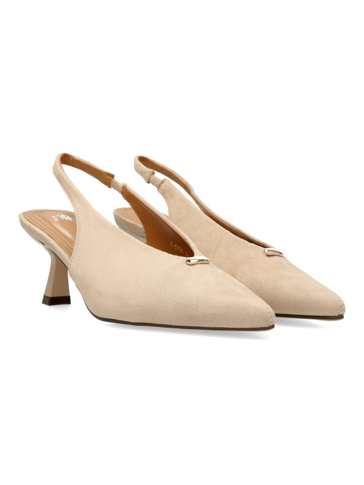 Zapato salón de mujer, con puntera fina y destalonado. Fabricado en antelina aterciopelada. Planta acolchada. Disponible en color beige. Tacón fino de 6 cm. de altura. Modelo cómodo y elegante, ideal para fiestas, eventos y celebraciones.