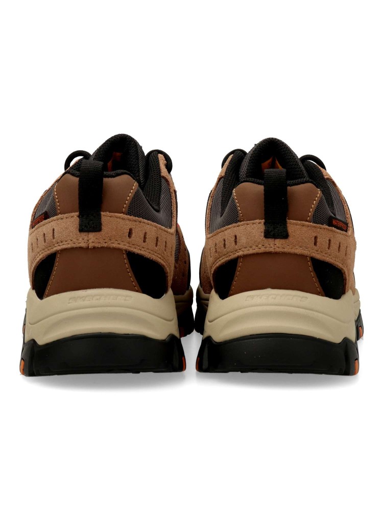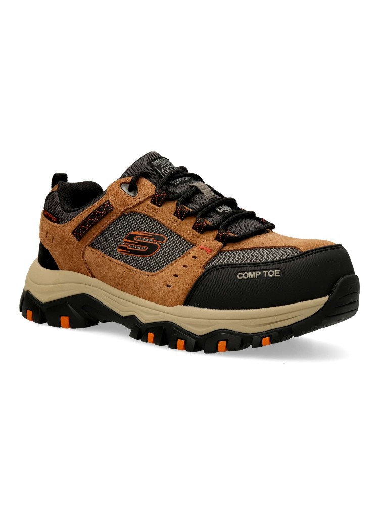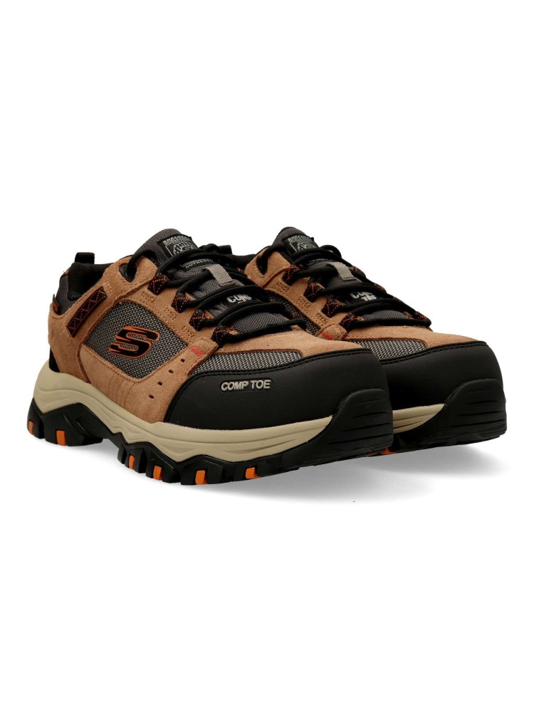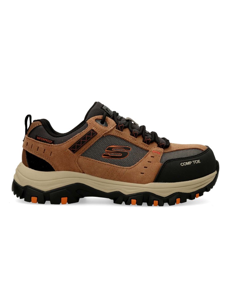 Modelo de senderismo impermeable, con parte superior de ante y tejido ripstop, puntera de seguridad de material compuesto no metálico y plantilla con amortiguación Skechers Air-Cooled Memory Foam™. Máxima cómodidad y protección.