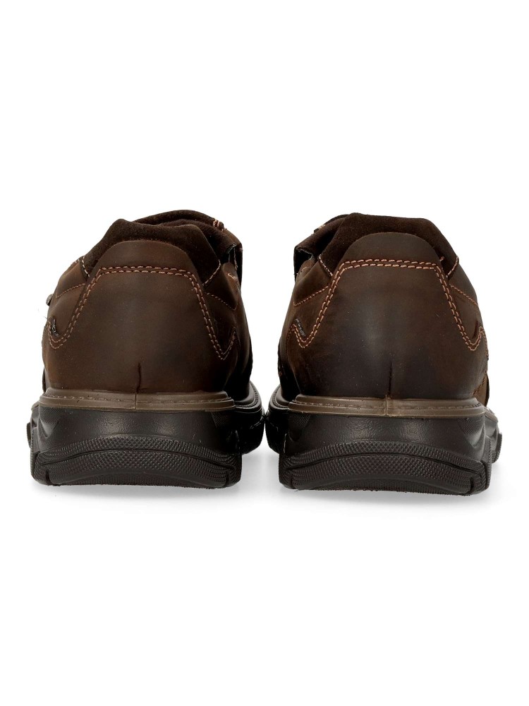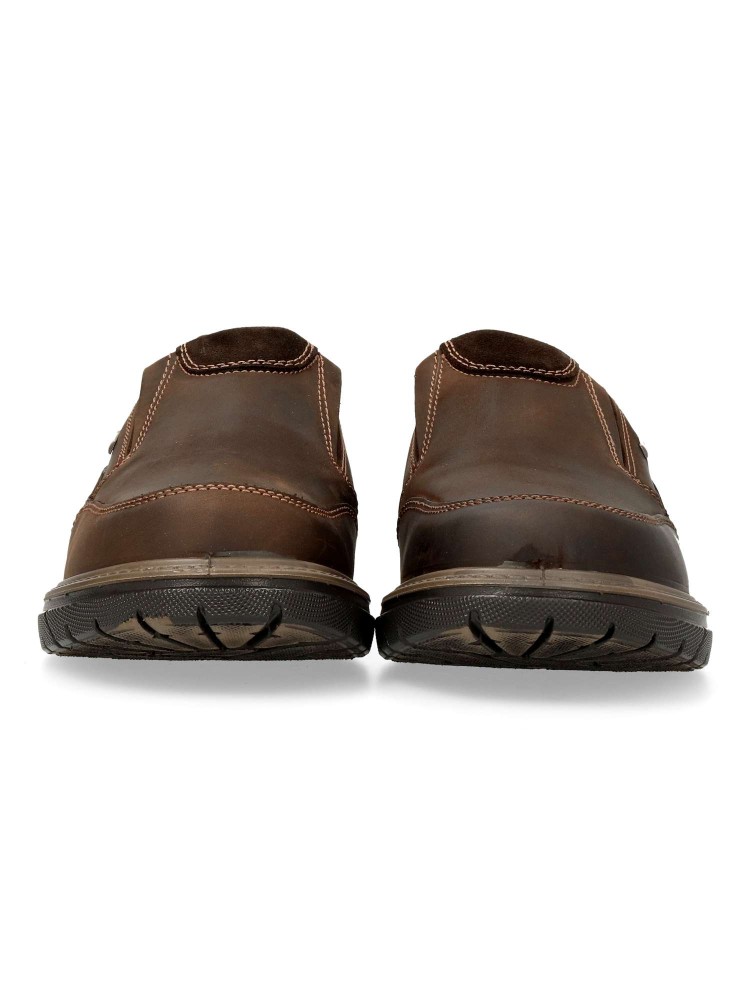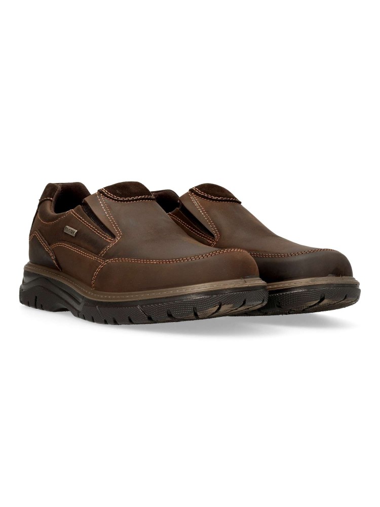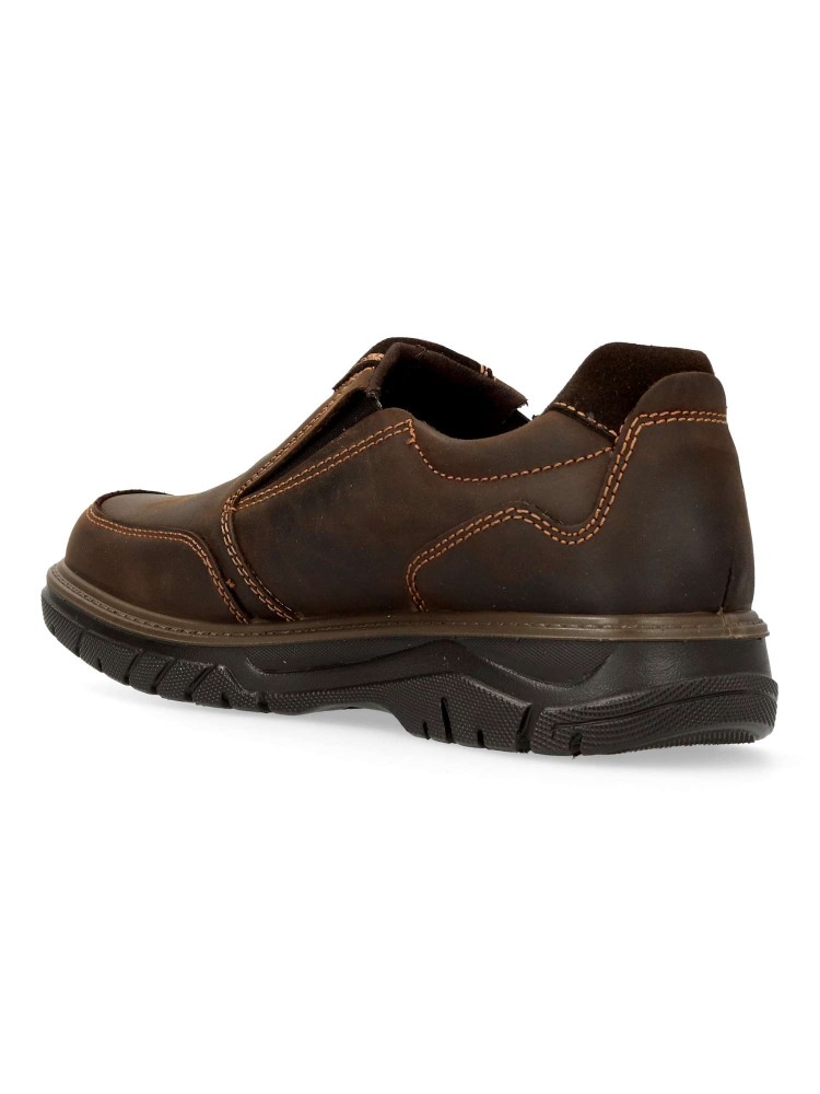 Zapato mocasín cómodo de hombre, con elásticos Modelo extra-ancho, fabricado en piel natural, con suela de goma, tecnología Shock Absorber. Plantilla extraíble de piel. Tecnología Imac Tex (resistente al agua). Color marrón. Diseño clásico y confort.