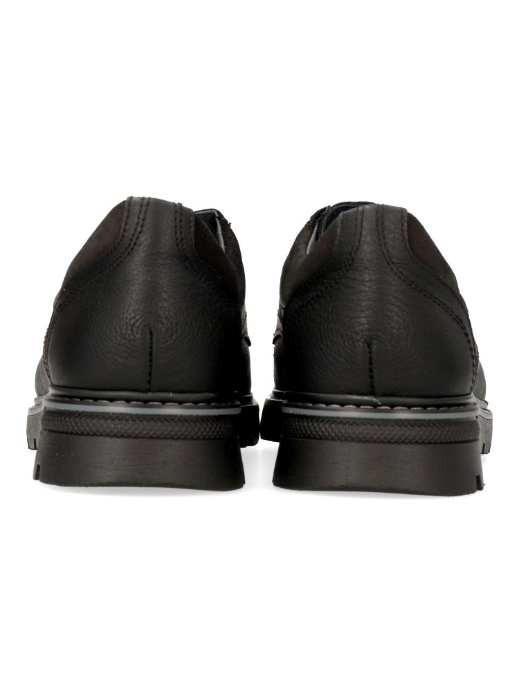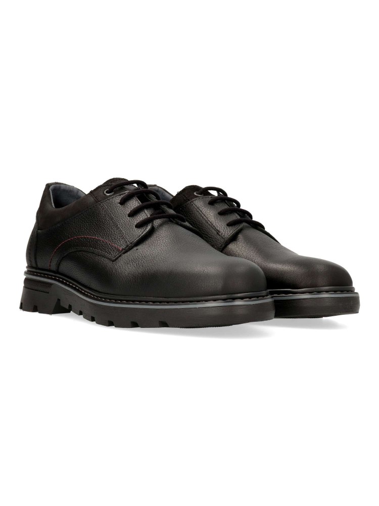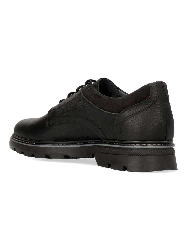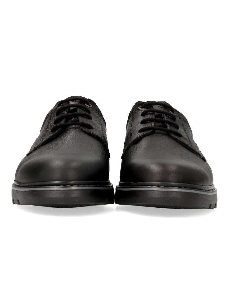 Zapato de vestir tipo oxford, con cierre de cordones. Modelo cómodo, fabricado en piel suave, con suela de goma antideslizante. Plantilla acolchada. Color negro. Un clásico de temporada, cómodo y versátil, ideal para vestir arreglado. Hecho en España.