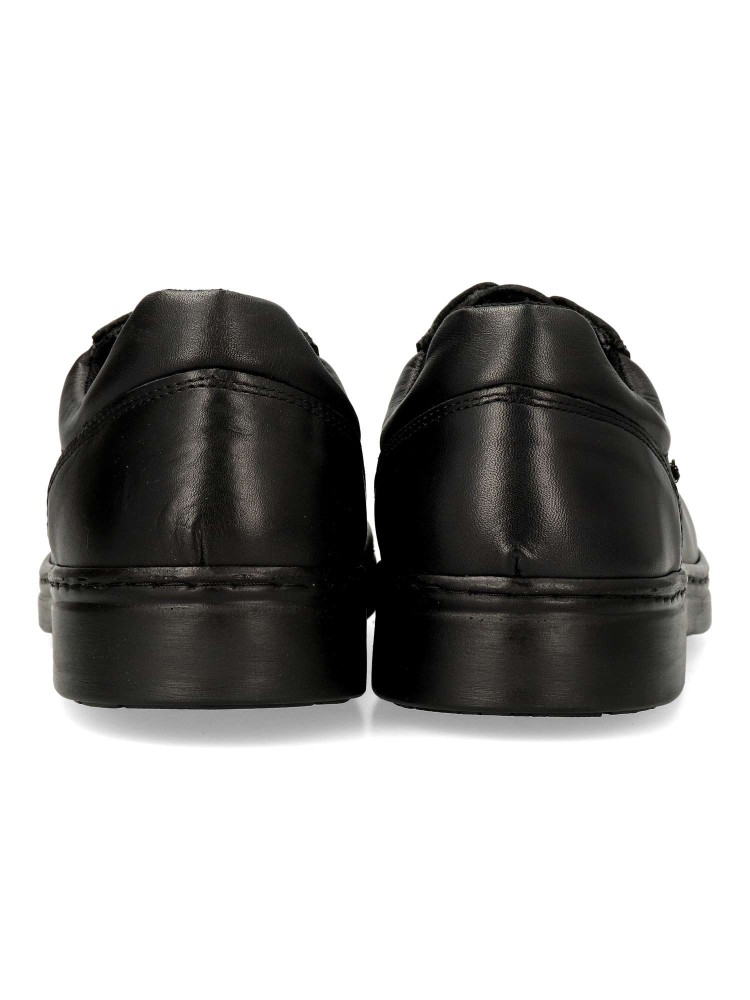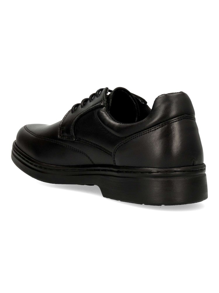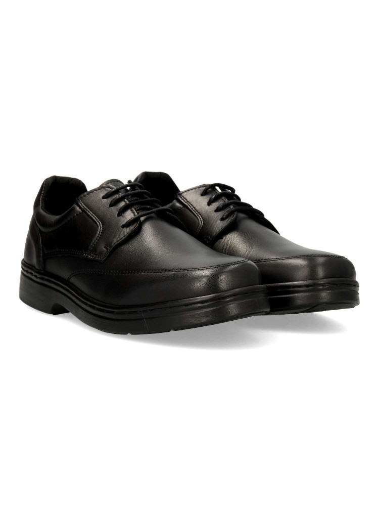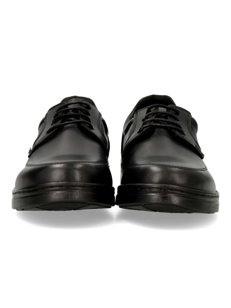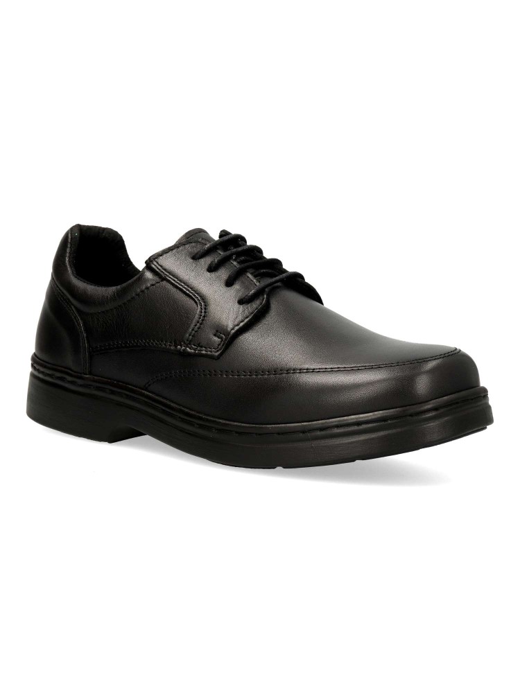 Zapato cómodo de hombre. Modelo tipo blucher, con cierre de cordones. Fabricado en piel con suela de goma flexible y ligera. Plantilla acolchada y extraíble. Color negro. Ideal tanto para tu día a día, como para uso profesional.