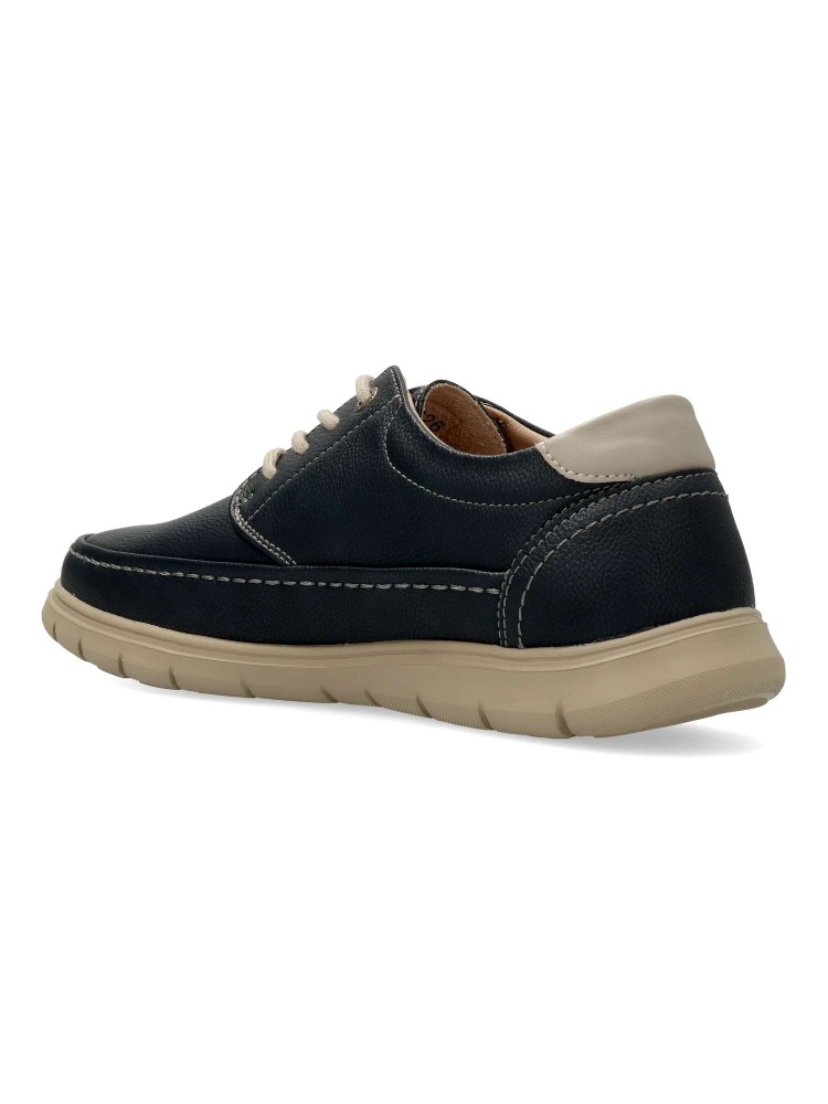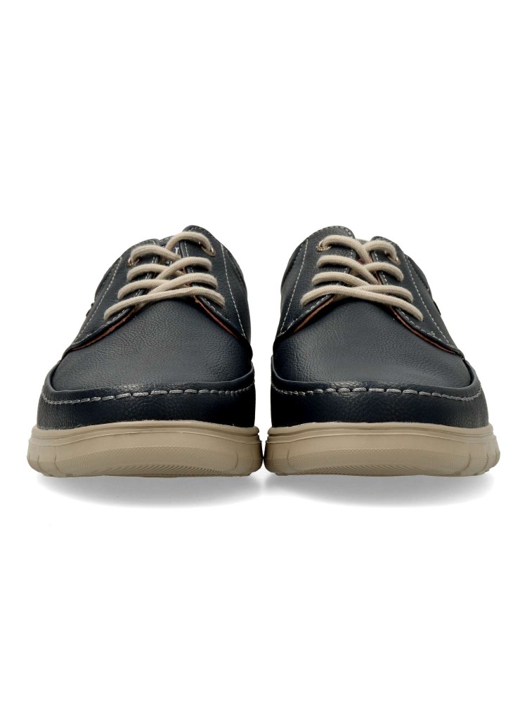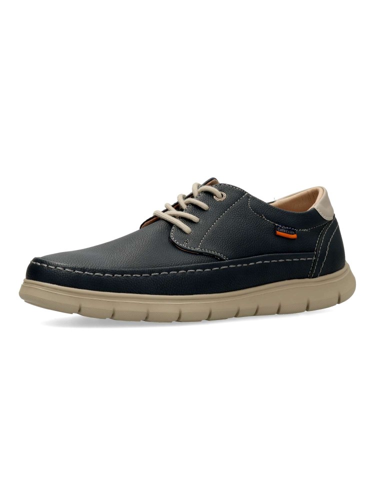 Zapato blucher de hombre, estilo casual. Cierre de cordones. Modelo cómodo, fabricado en piel sintética, con suela de goma ligera y flexible. Plantilla de piel acolchada y extraíble. Color azul. Ideal para vestir arreglado o con ropa más informal.