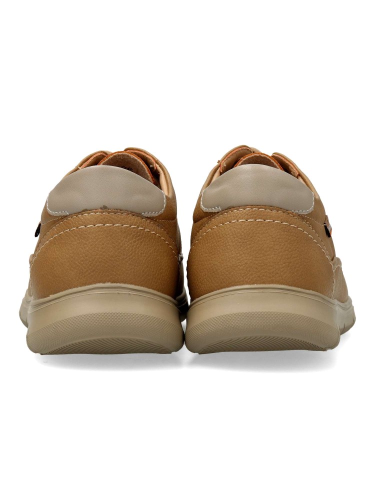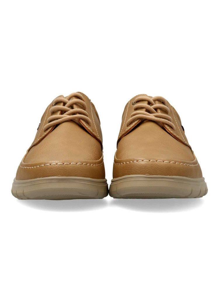 Zapato blucher de hombre, estilo casual. Cierre de cordones. Modelo cómodo, fabricado en piel sintética, con suela de goma ligera y flexible. Plantilla de piel acolchada y extraíble. Color taupe. Ideal para vestir arreglado o con ropa más informal.
