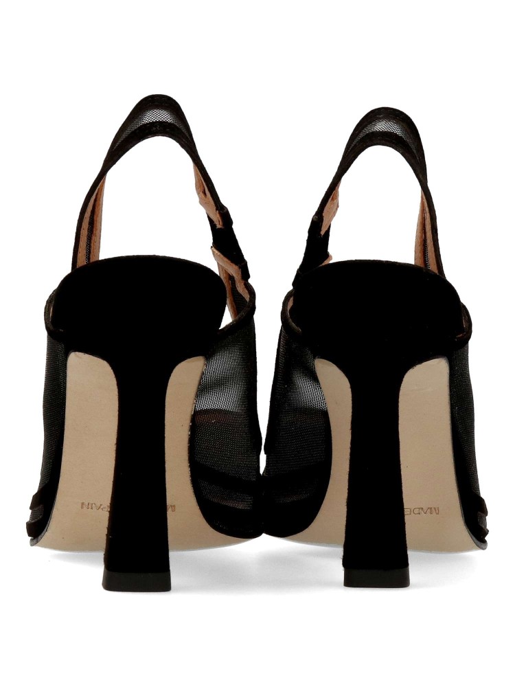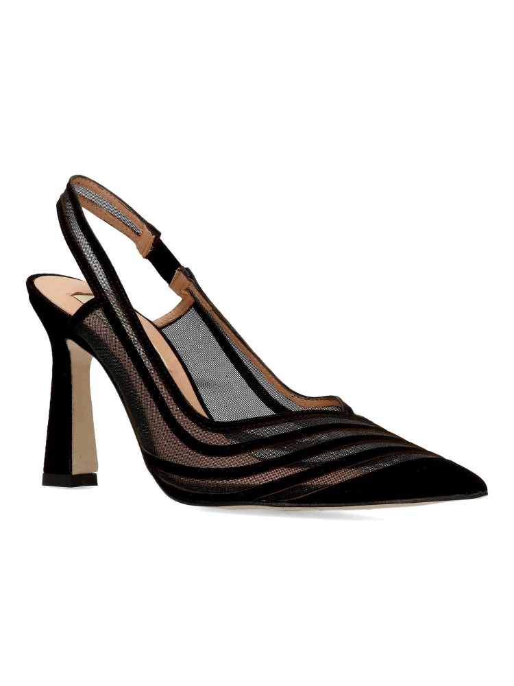 Zapato de fiesta, con tacón alto realizado en rejilla y tiras muy finas en terciopelo. Ideal para vestidos muy elegantes, siendo el complemento perfecto para que tu look sea perfecto. Diseño elegante, muy recomendado para Novias, Madrinas e Invitadas.