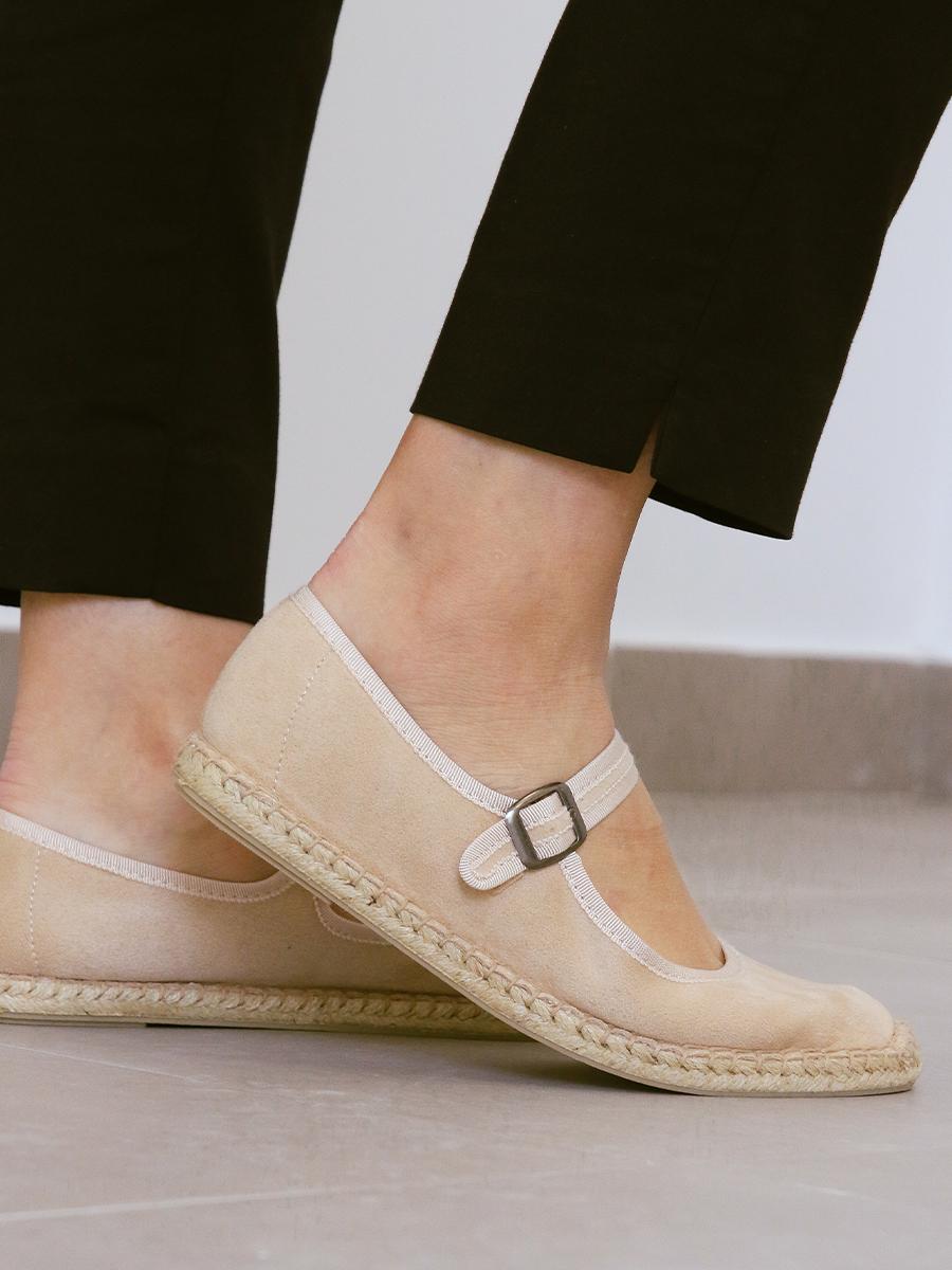 Zapato mercedita cómoda de mujer. Bailarina plana, fabricada en textil antelina, con suela de yute sobre goma. Tira al empeine con cierre de hebilla. Planta acolchada. Cómoda, resistente, transpirable y muy versátil para la mujer de hoy en día.