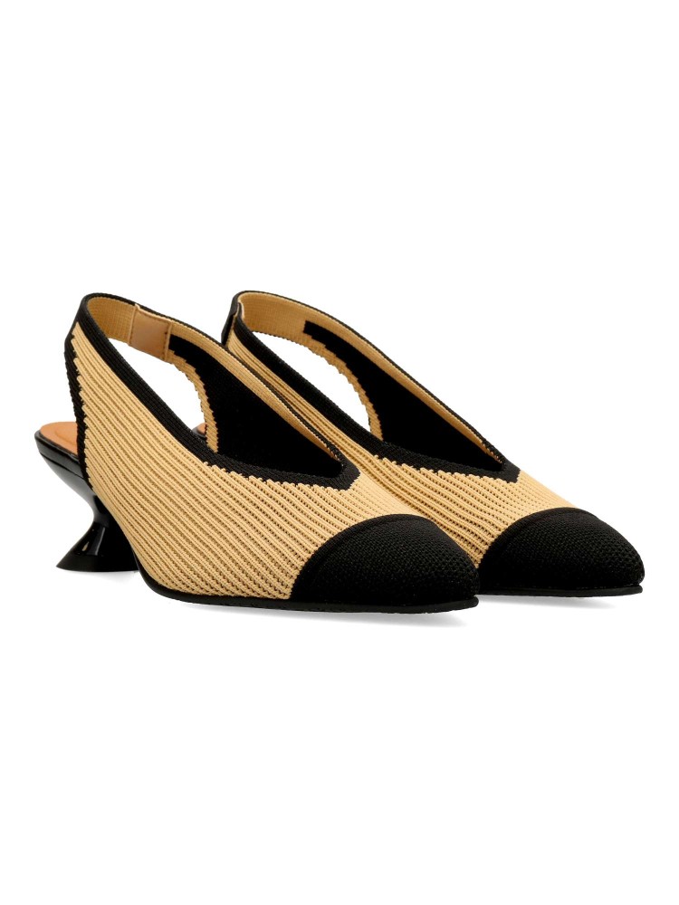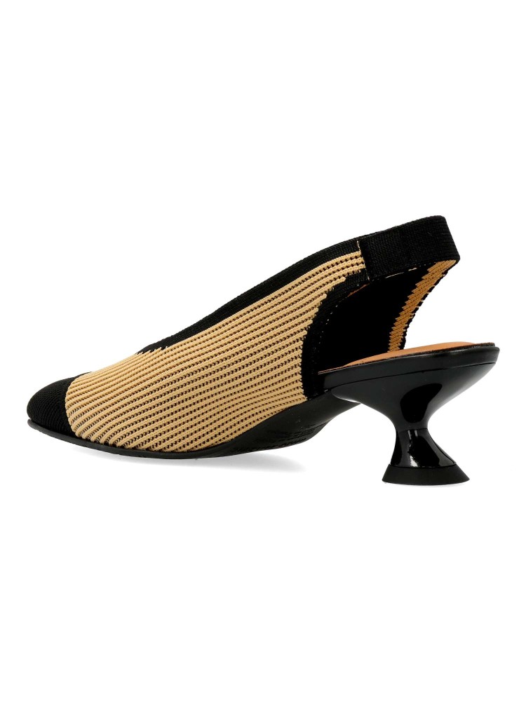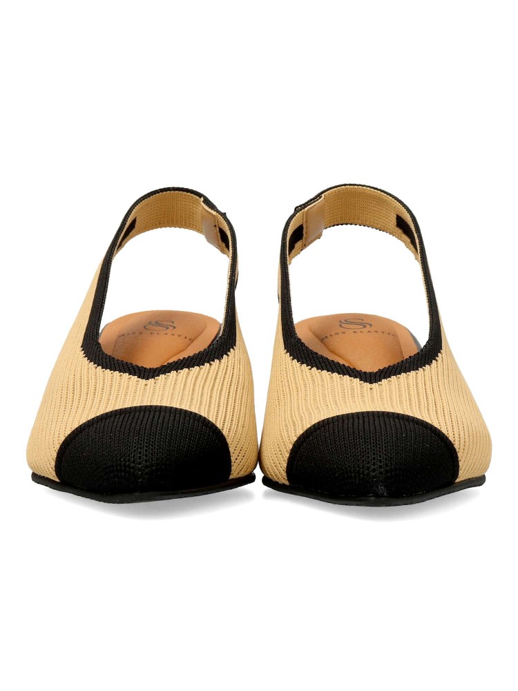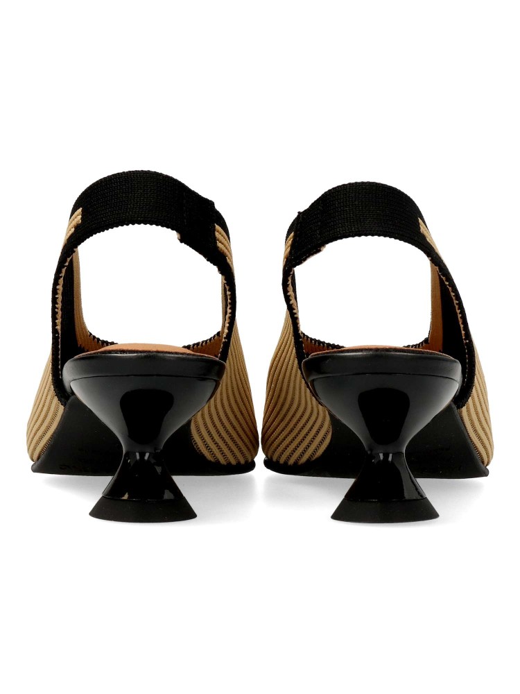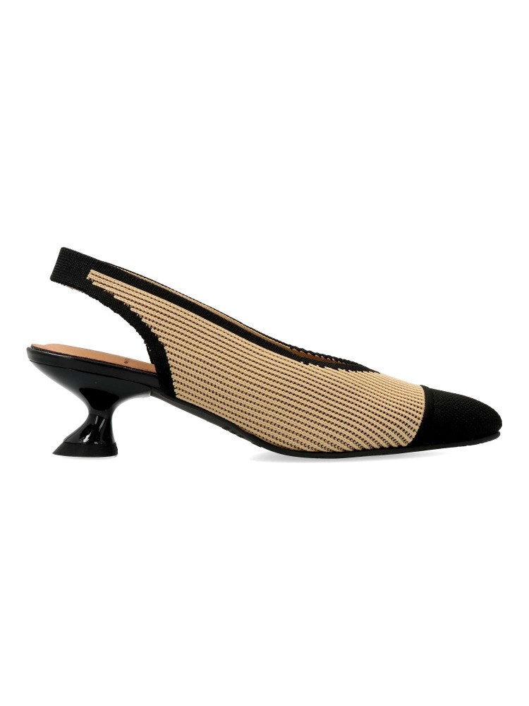 Salones destalonados para Mujer estilo atemporal. Punta fina y tacón de 5 cm. Fabricado en tejido ECO-elástico ajustable de color camel-negro. Transpirable, antibacterias y con tecnología “Adaptative Style” sin componentes de origen animal.