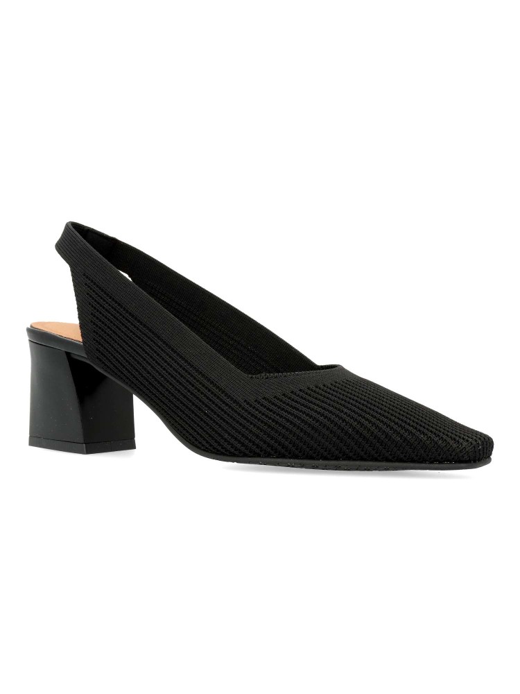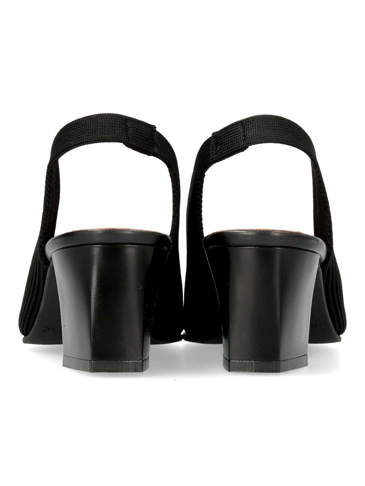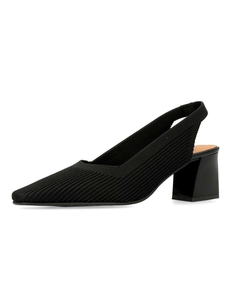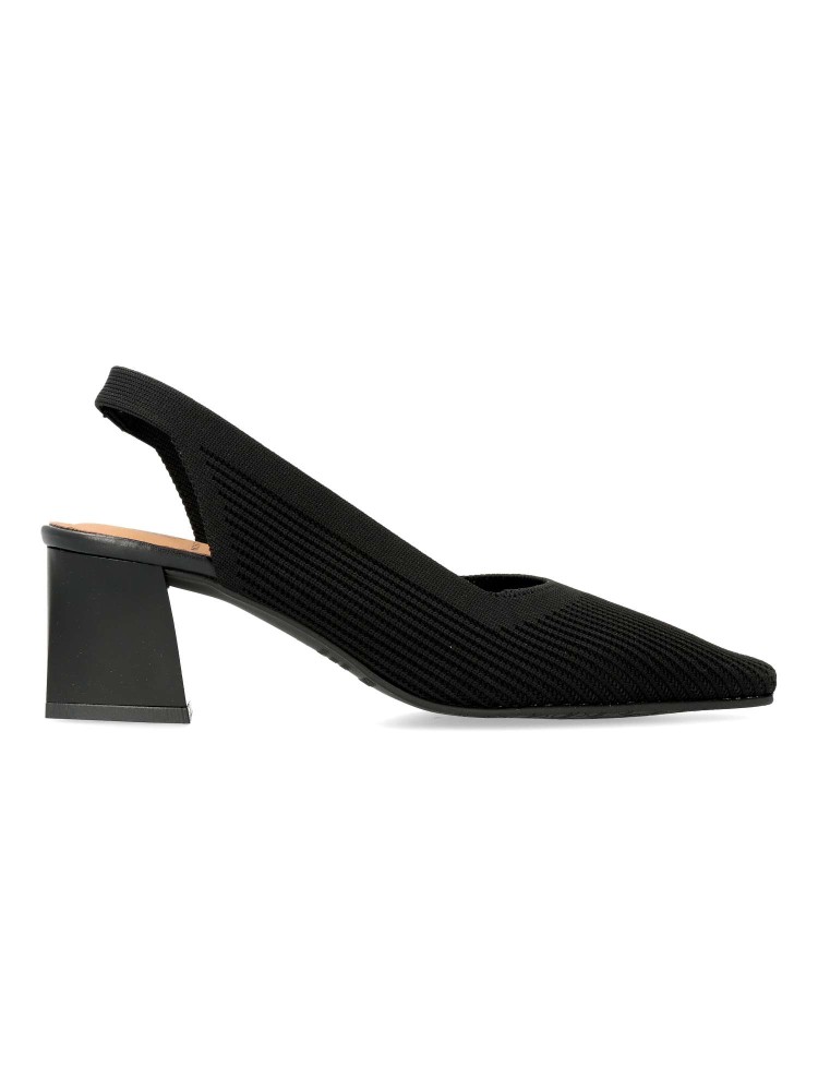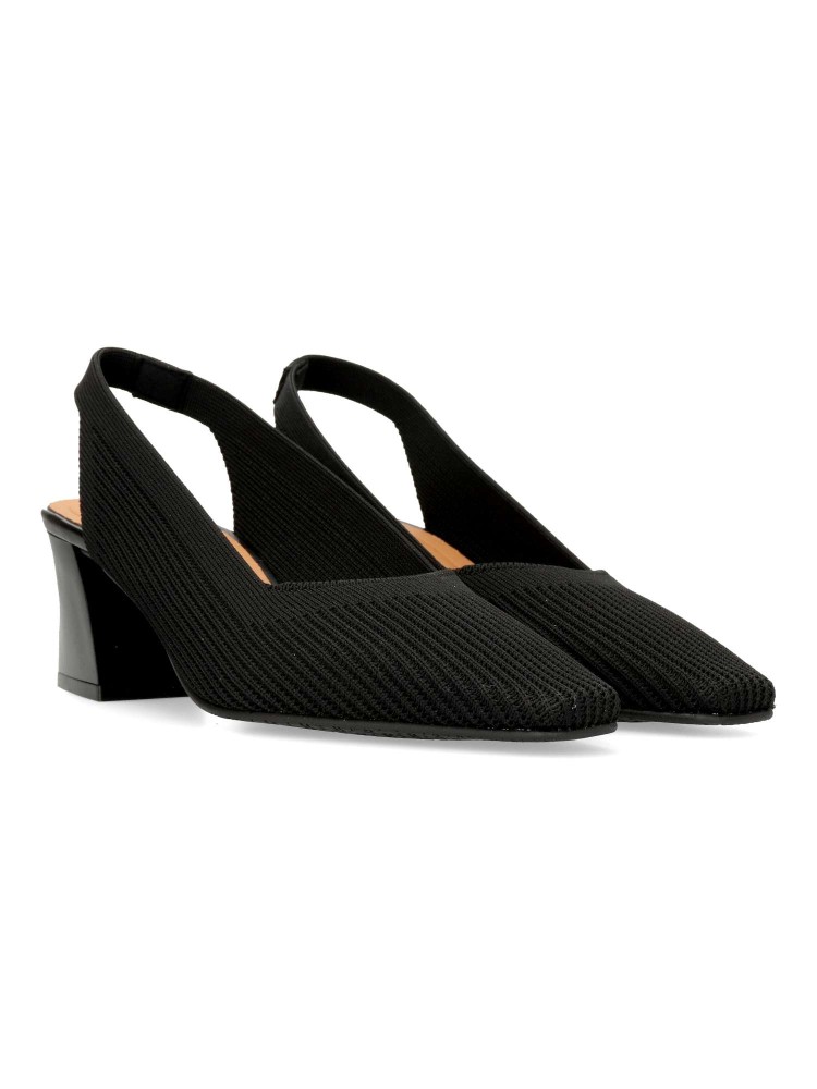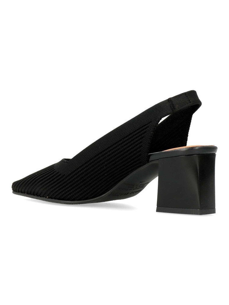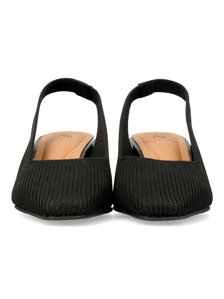 Salones destalonados para Mujer estilo atemporal. Punta fina y tacón de 5,5 cm. Fabricado en tejido ECO-elástico ajustable de color negro. Transpirable, antibacterias y con tecnología “Adaptative Style” sin componentes de origen animal.