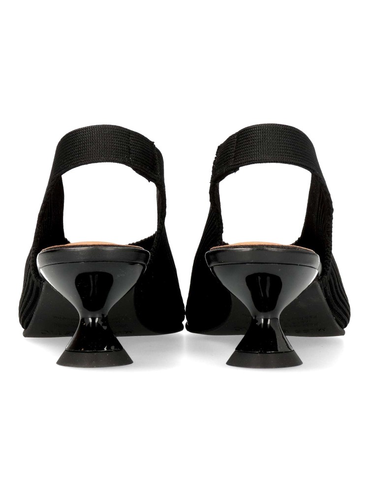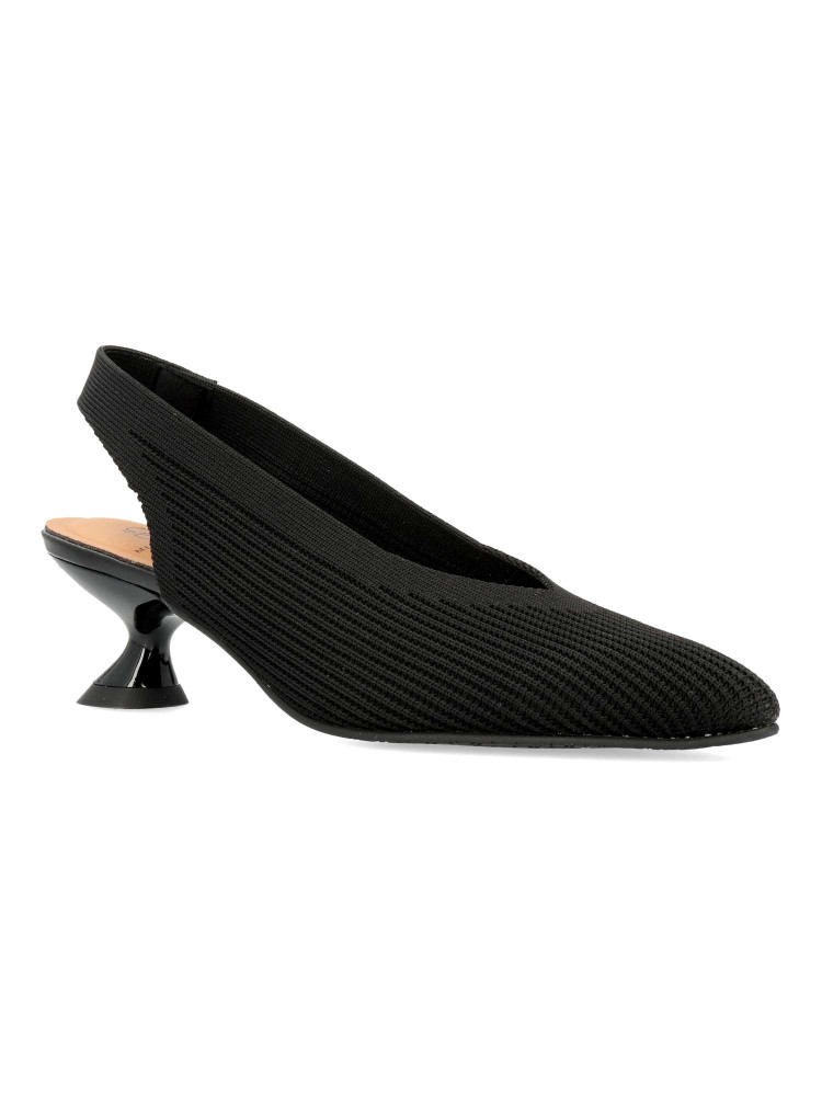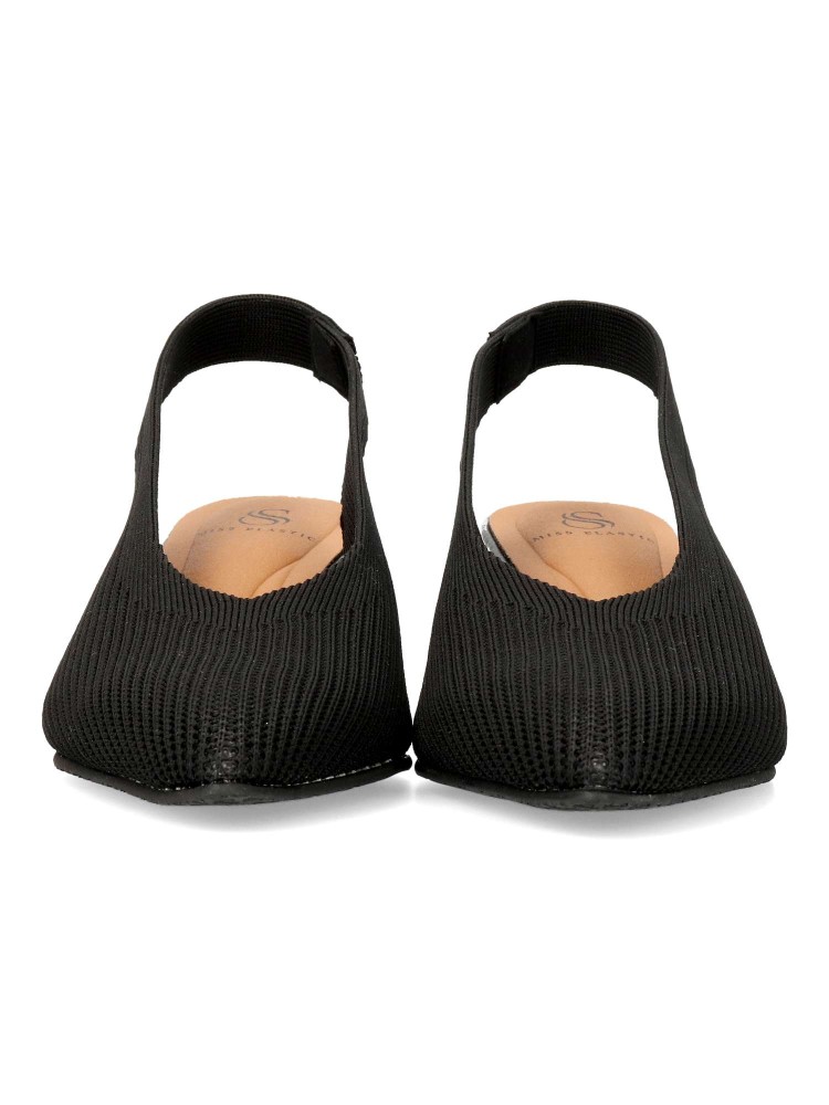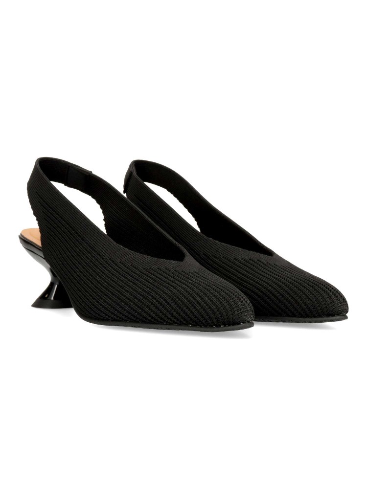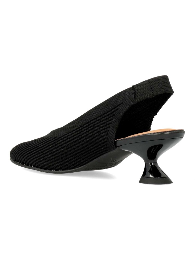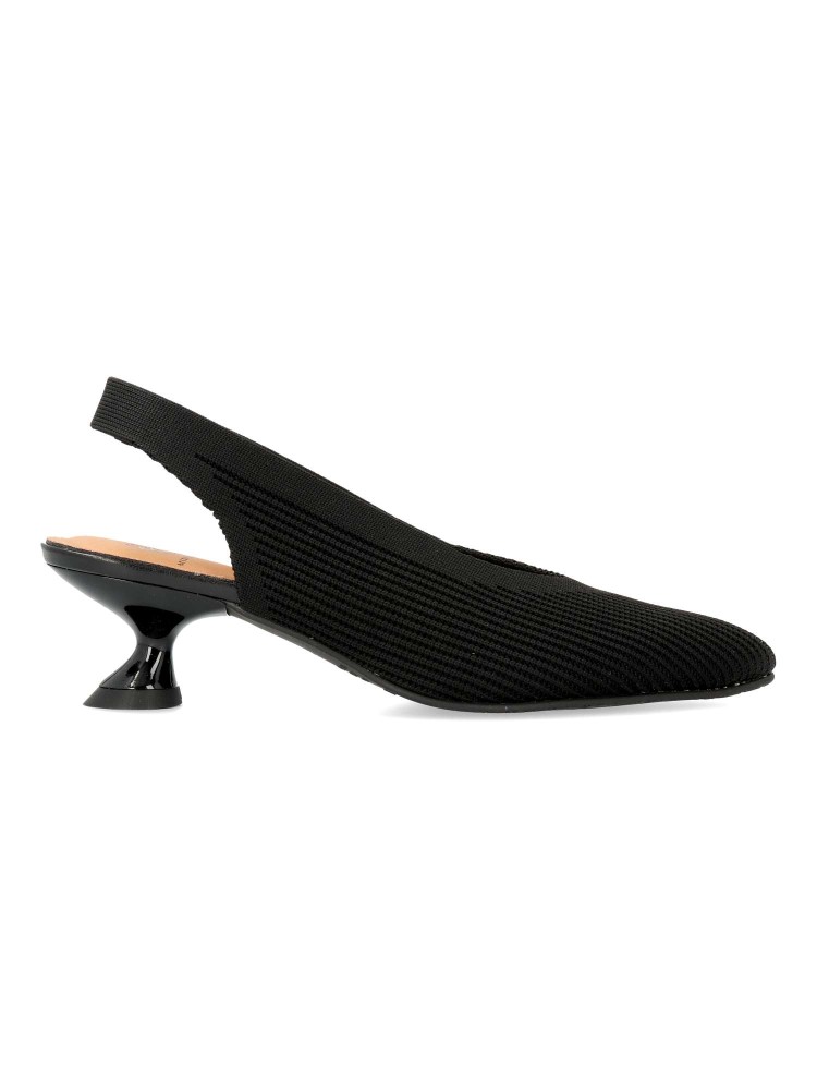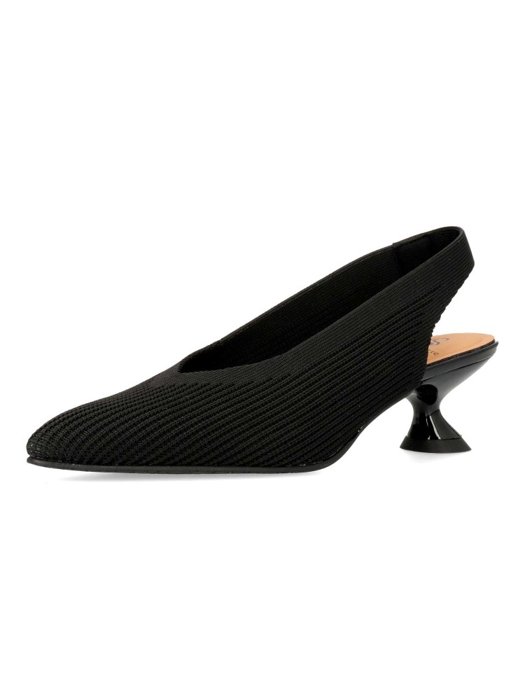 Salones destalonados para mujer estilo atemporal. Punta fina y tacón de 5 cm. Fabricado en tejido ECO-elástico ajustable de color negro. Transpirable, antibacterias y con tecnología “Adaptative Style” sin componentes de origen animal.