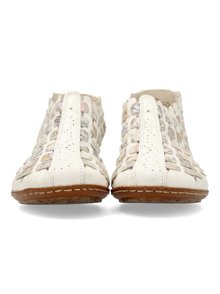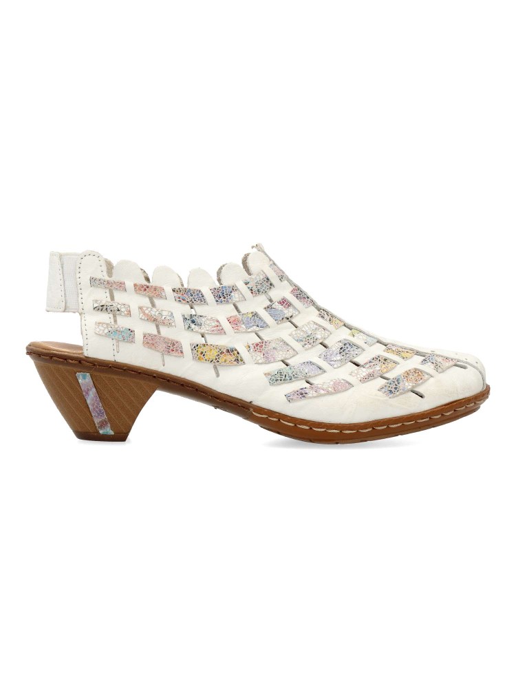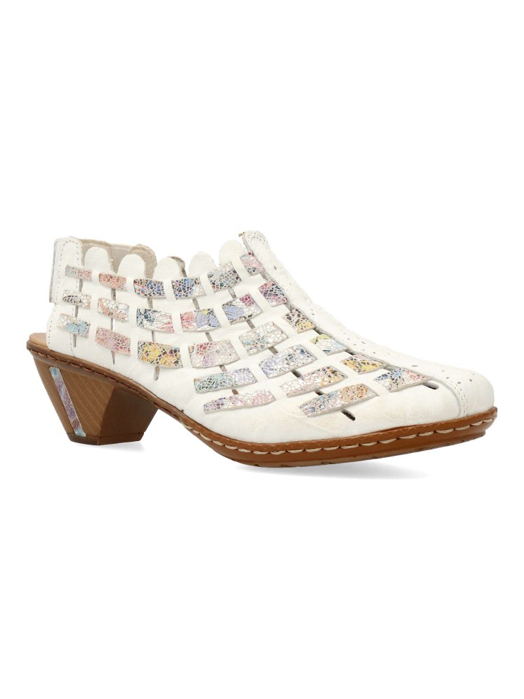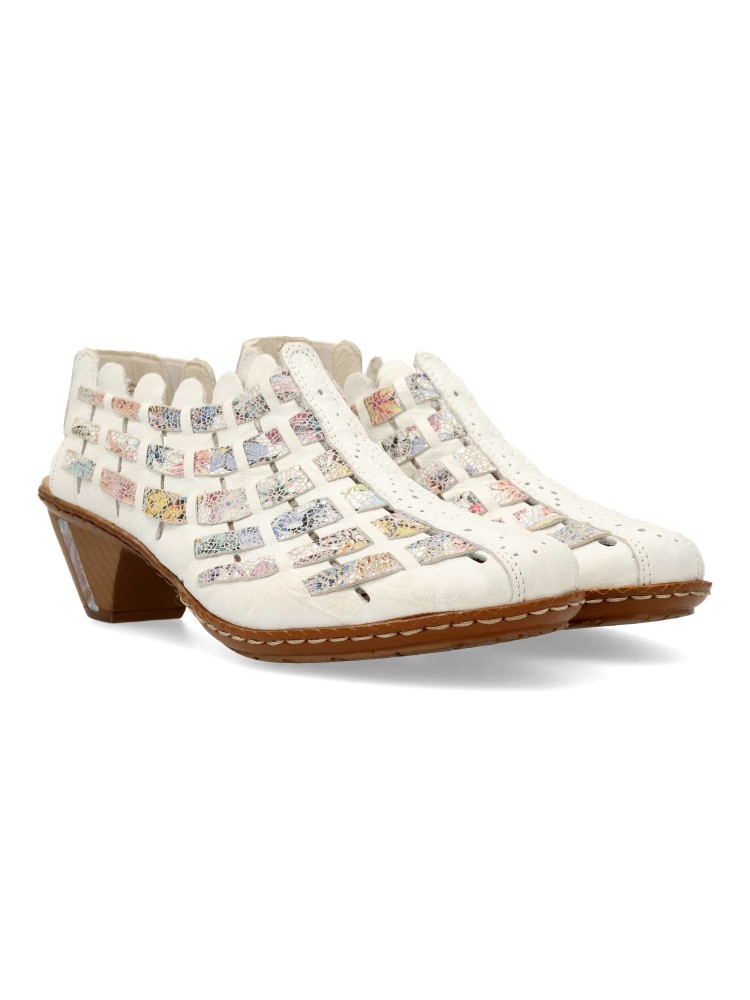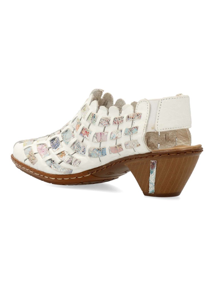 Zapato cómodo de mujer. Modelo ligero y destalonado. Fabricado en piel con suela de goma flexible. Disponible en color blanco. Tacón ancho de 4 cm. de altura. Estilo atrevido y polivalente para combinar con todas tus prendas. Rieker Antistress.