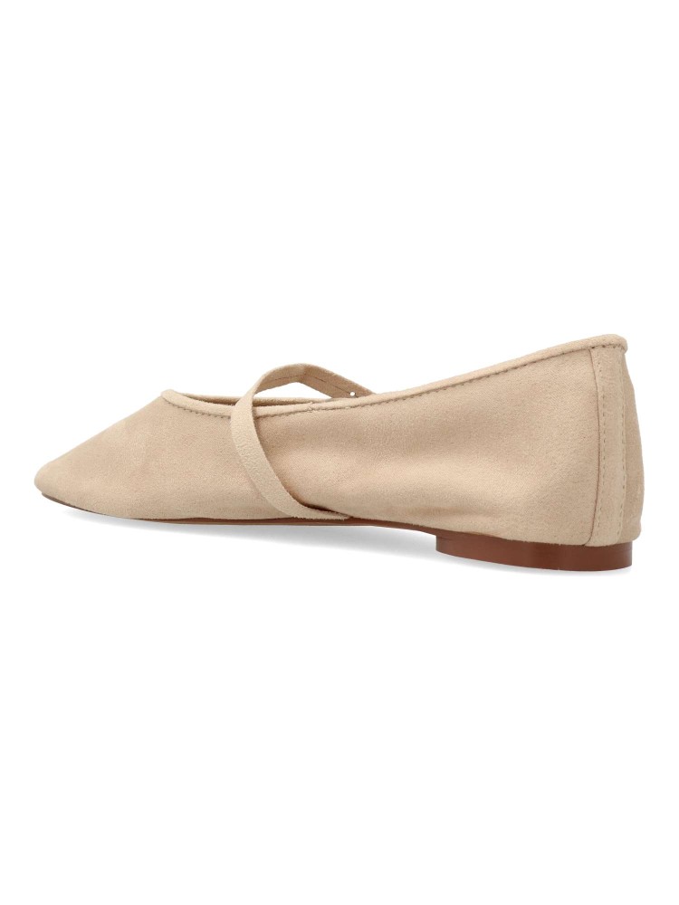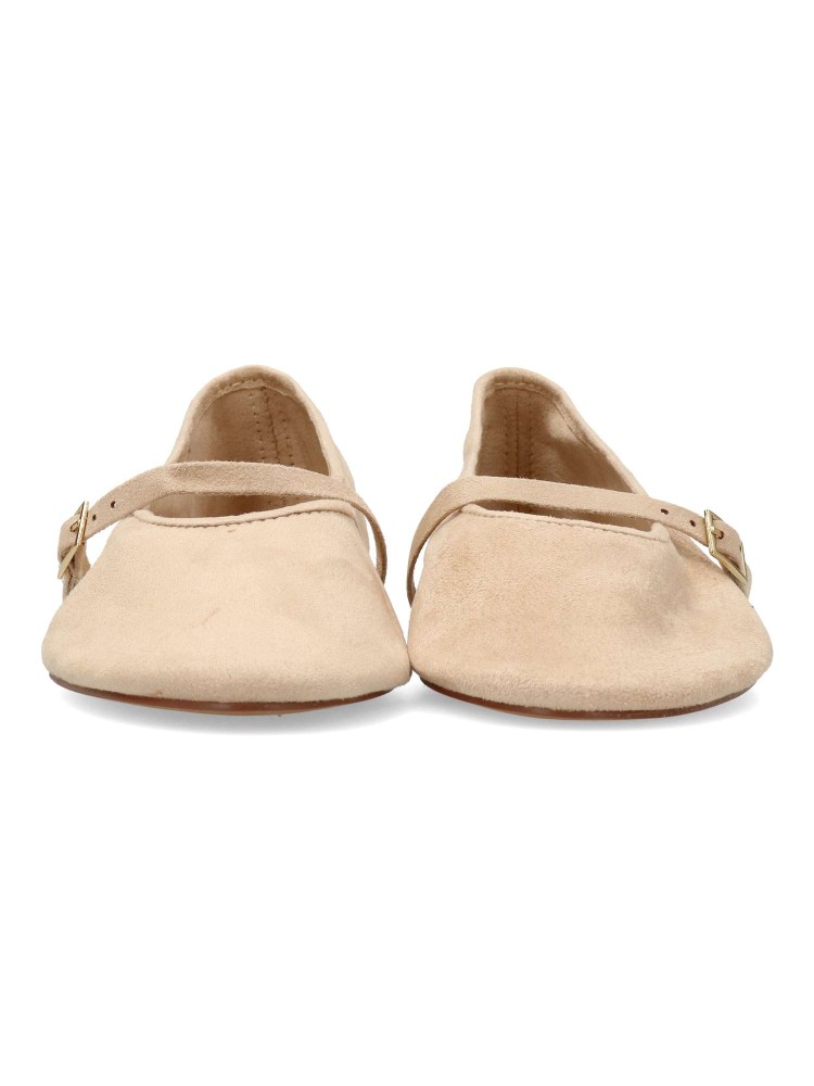 Zapato bailarina de mujer, con tira al empeine y cierre de hebilla. Mercedita plana, fabricada en textil antelina, con suela de goma flexible. Planta acolchada. Disponible en color natural. Todo un clásico que no puede faltar en tu fondo de armario.