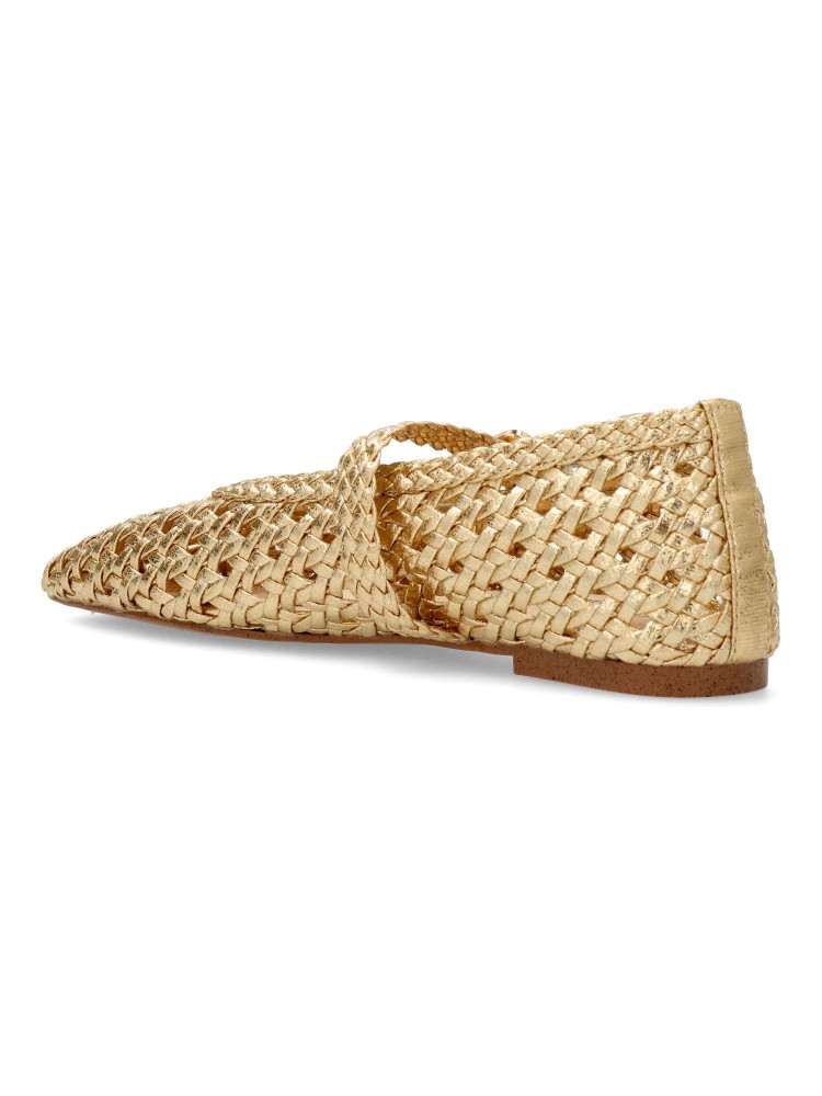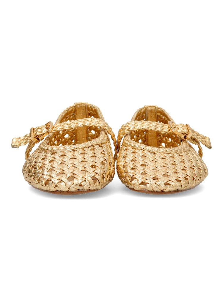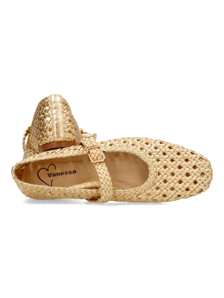 Zapato Mary Jane de mujer, con tira al empeine y cierre de hebilla. Mercedita plana, fabricada en piel sintética trenzada, con suela de goma. Planta acolchada. Disponible en color oro. Diseño original y elegante, que no puede faltar en tu fondo de armario