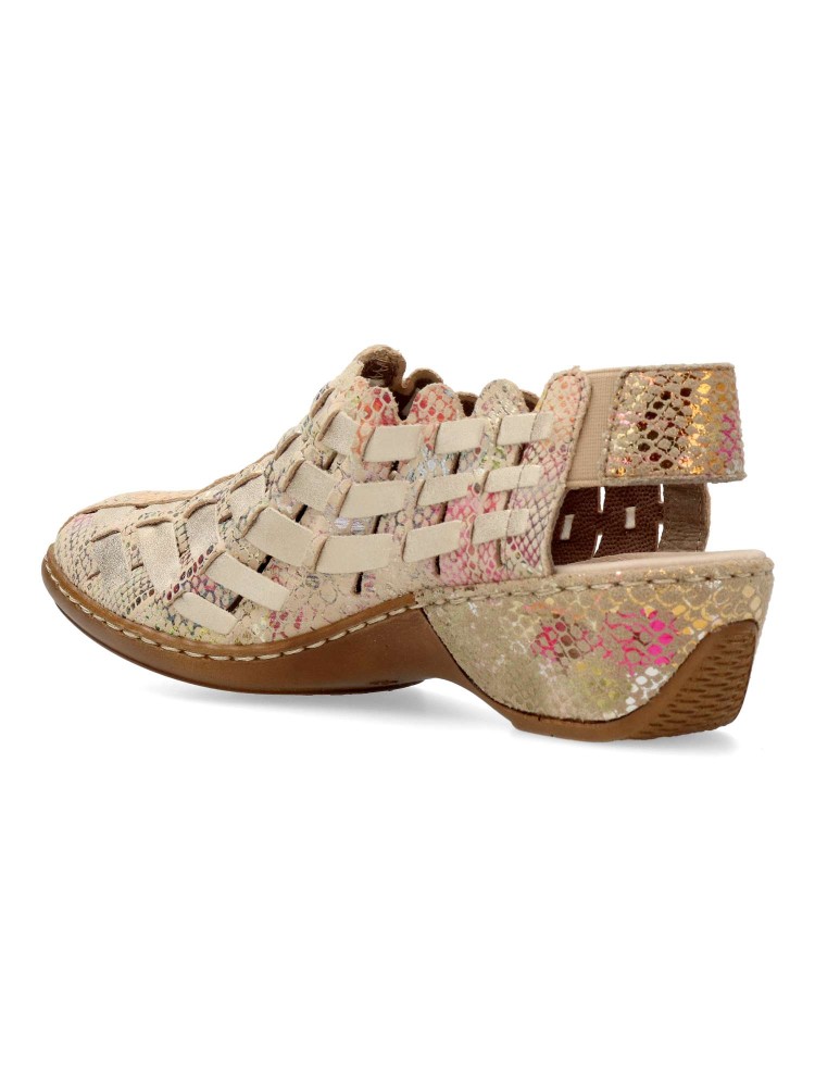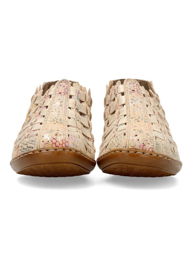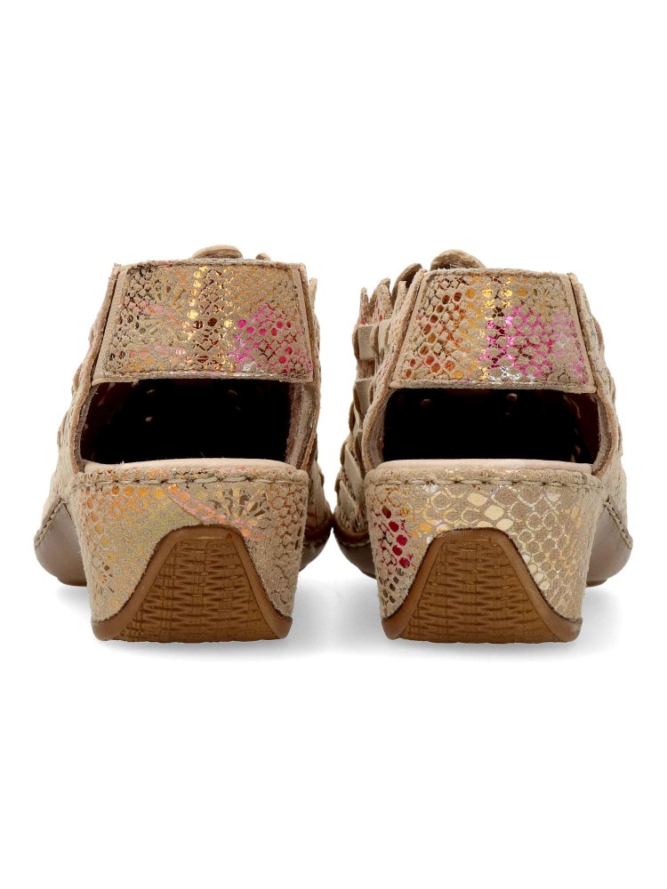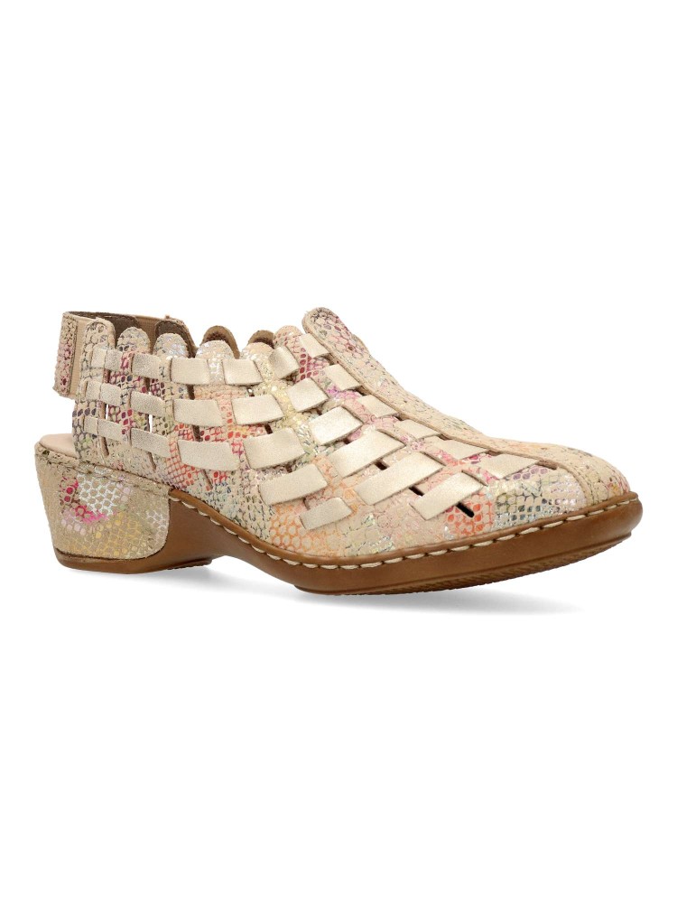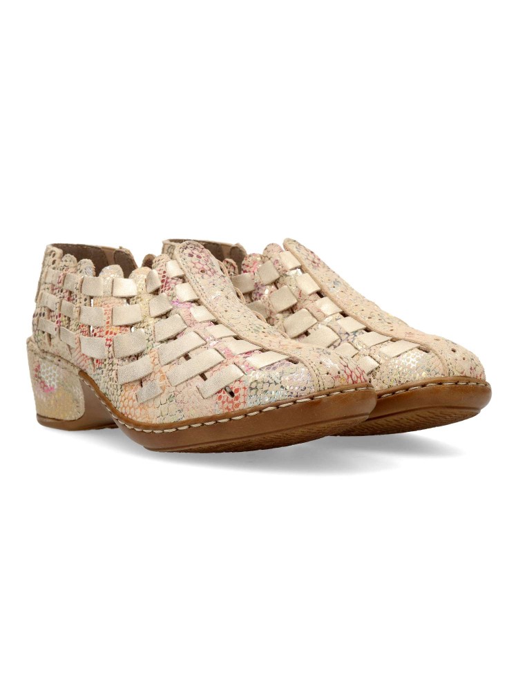 Zapato cómodo de mujer. Modelo ligero y destalonado. Fabricado en piel multicolor, con suela de goma flexible. Tacón ancho de 4 cm. de altura. Estilo atrevido y polivalente para combinar con todas tus prendas. Rieker Antistress.