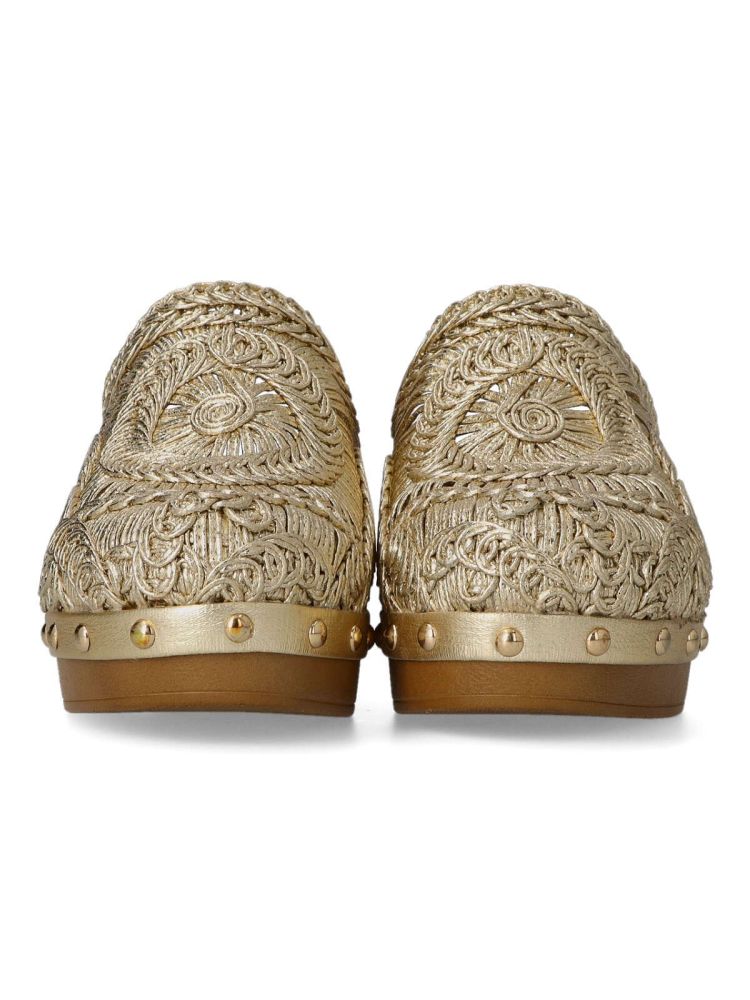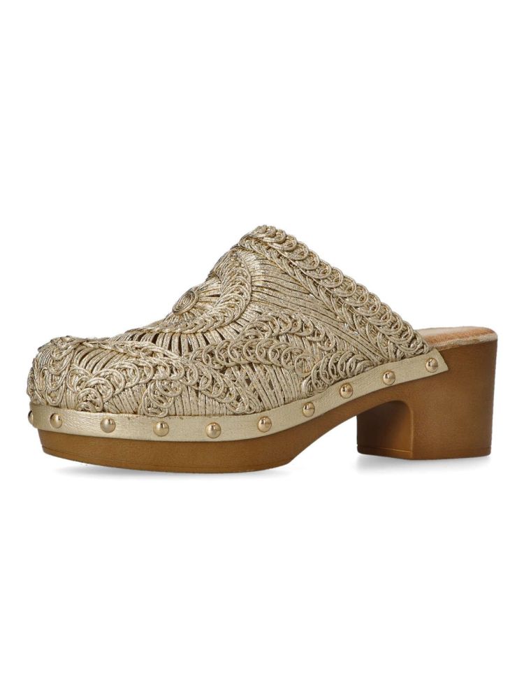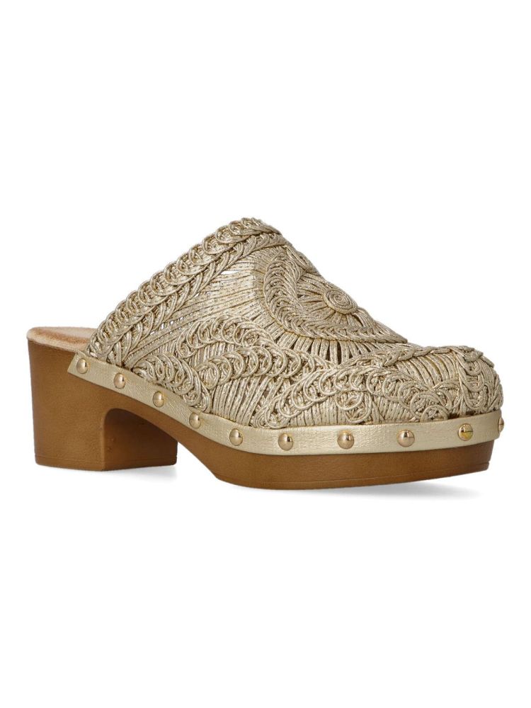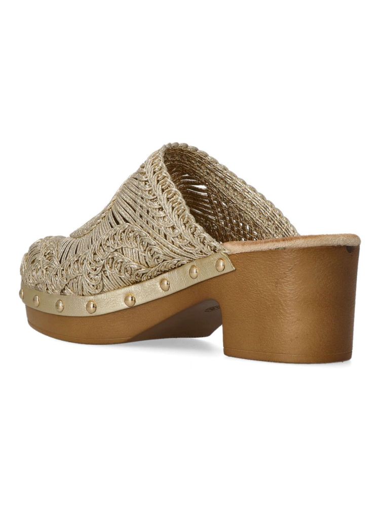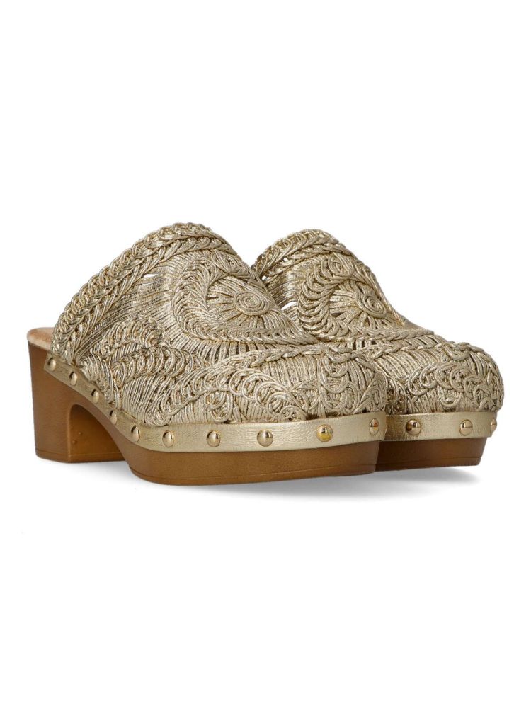 Zuecos con tacón y plataforma fabricados en material sintético trenzado color oro. Perfectos para utilizar durante la temporada de Primavera Verano. Tachas metalizadas que dan un acabado muy elegante. Su tacón es ancho y estable de 6 cm. Planta acolchada.